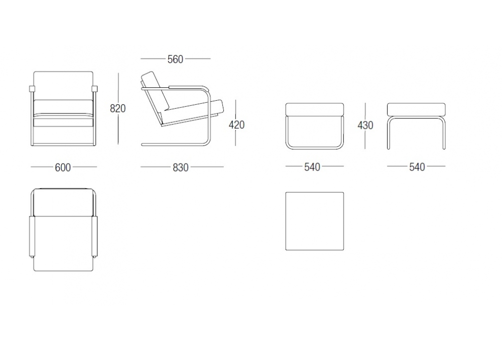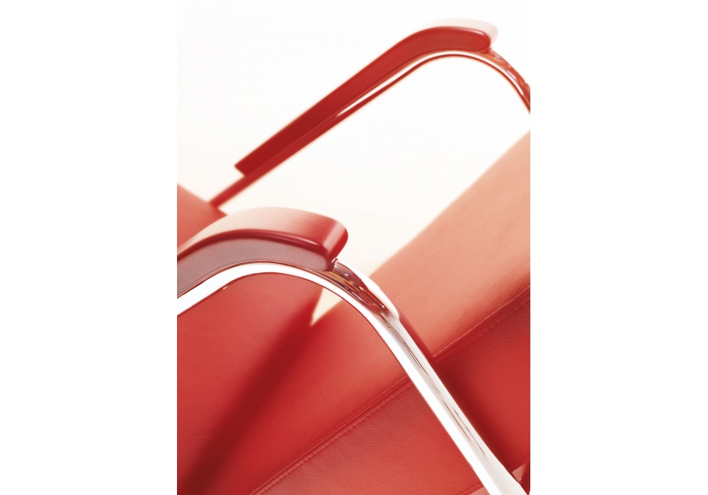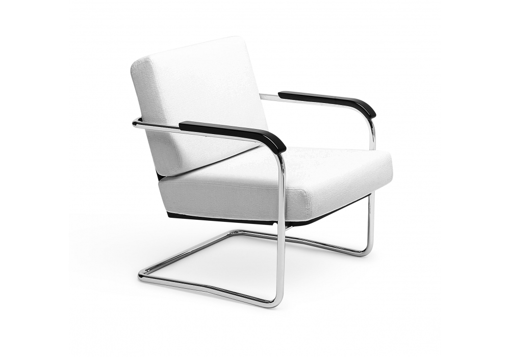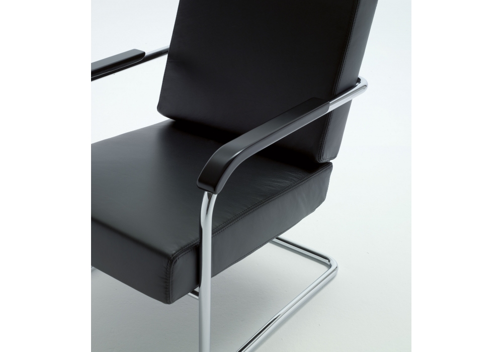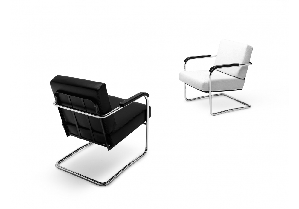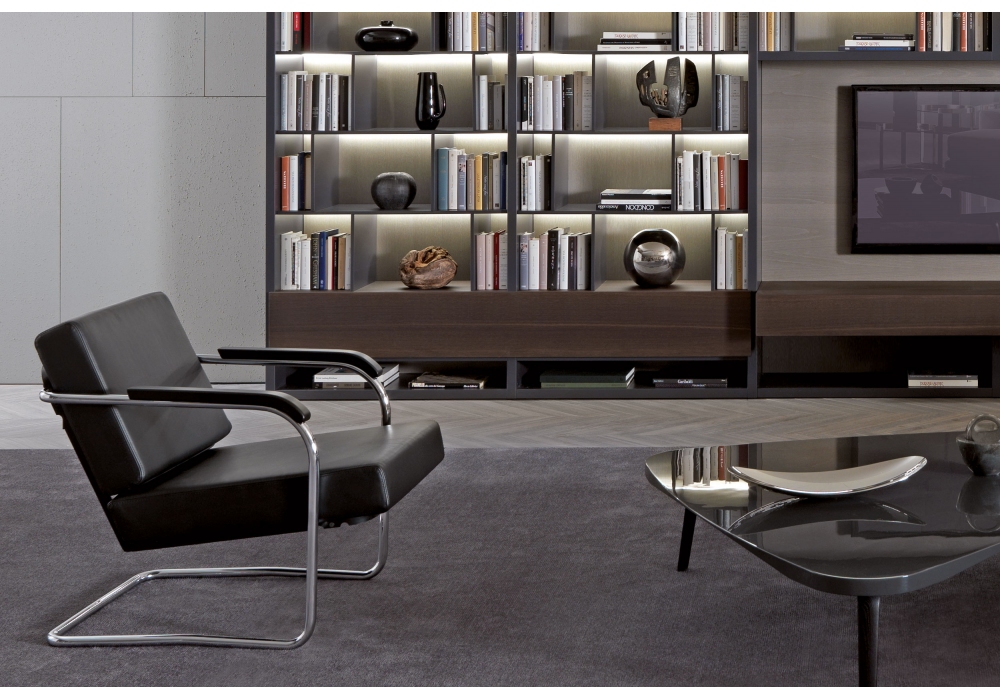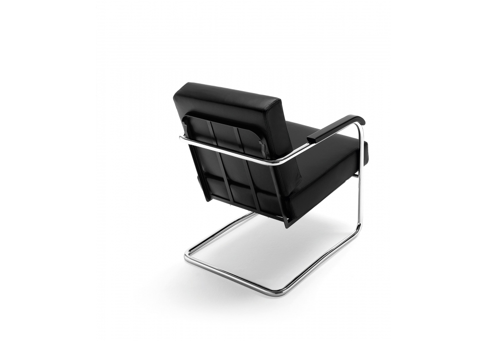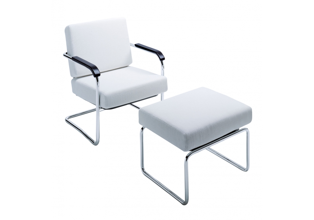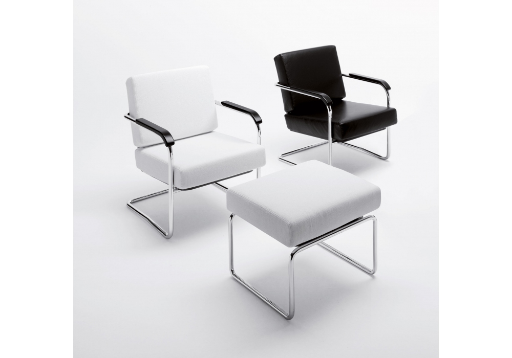 WM diseñado por Werner Max Moser para MisuraEmme es un sillón con estructura en tubular cromado y reposabrazos en madera maciza lacada en negro. Cojines de asiento y respaldo en espuma con refuerzo de madera contrachapada y tapizado desenfundable en tejido o piel. Disponible con o sin puf.
