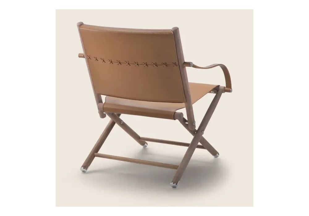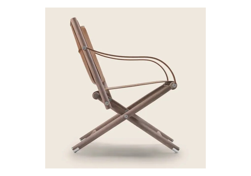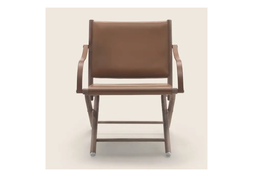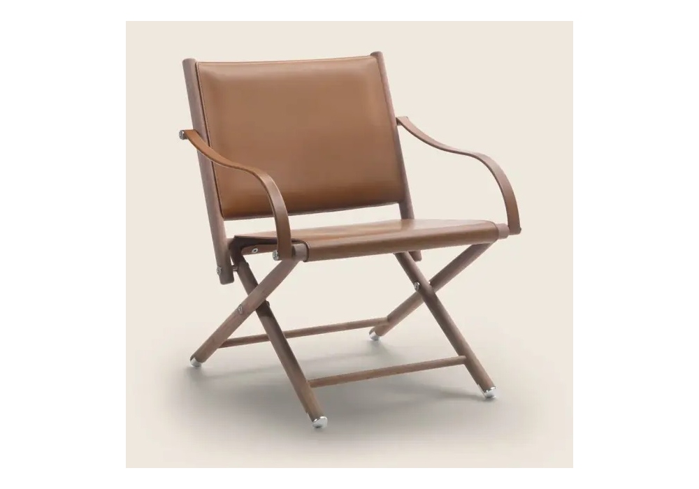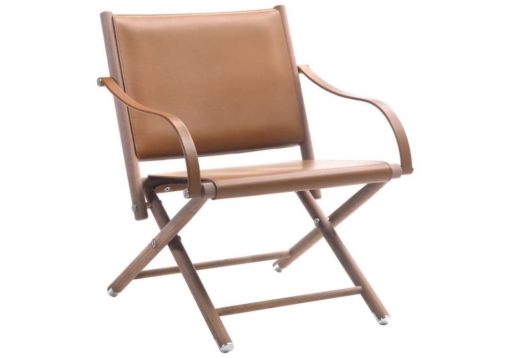 Lauren diseñado por Antonio Citterio para Flexform es un sillón con estructura plegable de madera, asiento y respaldo en cuero, disponible en diferentes acabados. Apoyabrazos de metal revestido de cuero del mismo color que el asiento/respaldo. Pies, tornillos y conectores metálicos en acabado cromado, bruñido o titanium mate 710.
