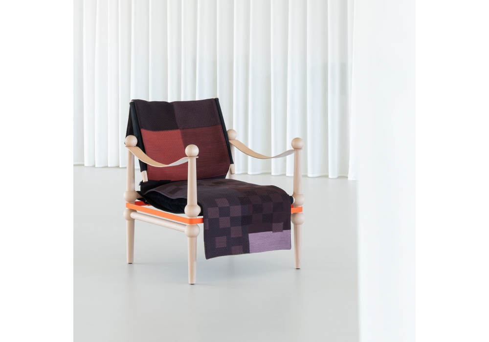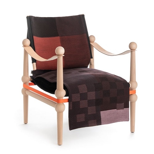 Twain Lounge diseñado por Konstantin Grcic en colaboración con Hella Jongerius para Magis es un sillón bajo con estructura de haya maciza, asiento y respaldo de tela, manta drapeada y reposabrazos de piel plena flor. Disponible en diferentes acabados.