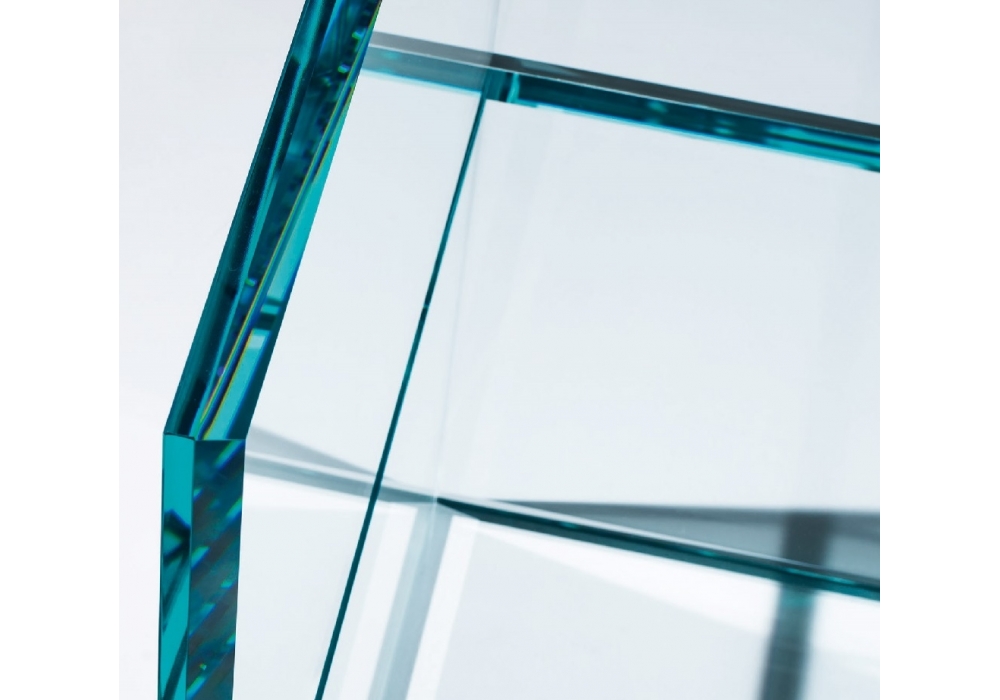 Prism Glass diseñado por Tokujin Yoshioka para Glas Italia es un sillón en vidrio transparente extraligero de 19 mm. templado y termosellado. Los cristales están acabados con biseles especiales, que reflejan y refractan la luz.