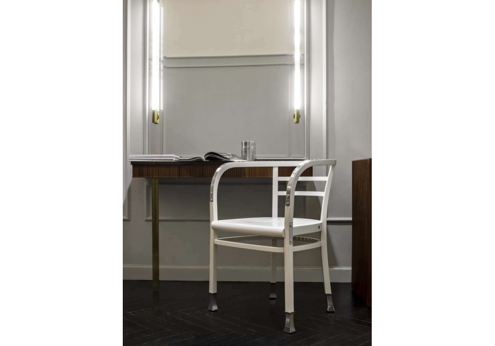 Postsparkasse diseñada por Otto Wagner para Gebrüder Thonet Vienna es una butaca realizada en haya curvada, disponible en diferentes acabados. Asiento en madera contrachapada perforada. La adición de detalles de aluminio también está disponible.