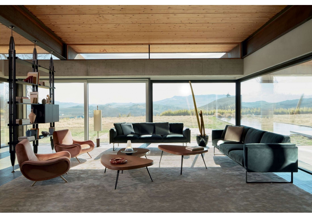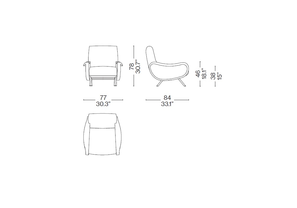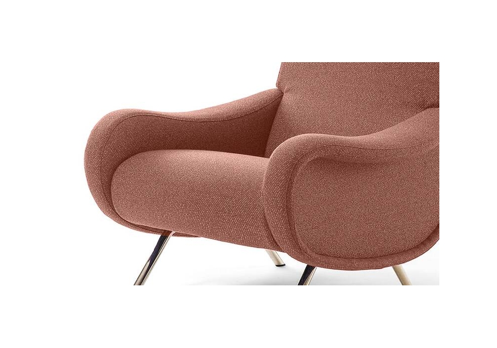 720 Lady diseñada por Marco Zanuso para Cassina es una butaca realizada con una estructura interna con marco de acero tubular equipado con correas elásticas, relleno de espuma de poliuretano y guata de poliéster y revestimiento de tela o piel.