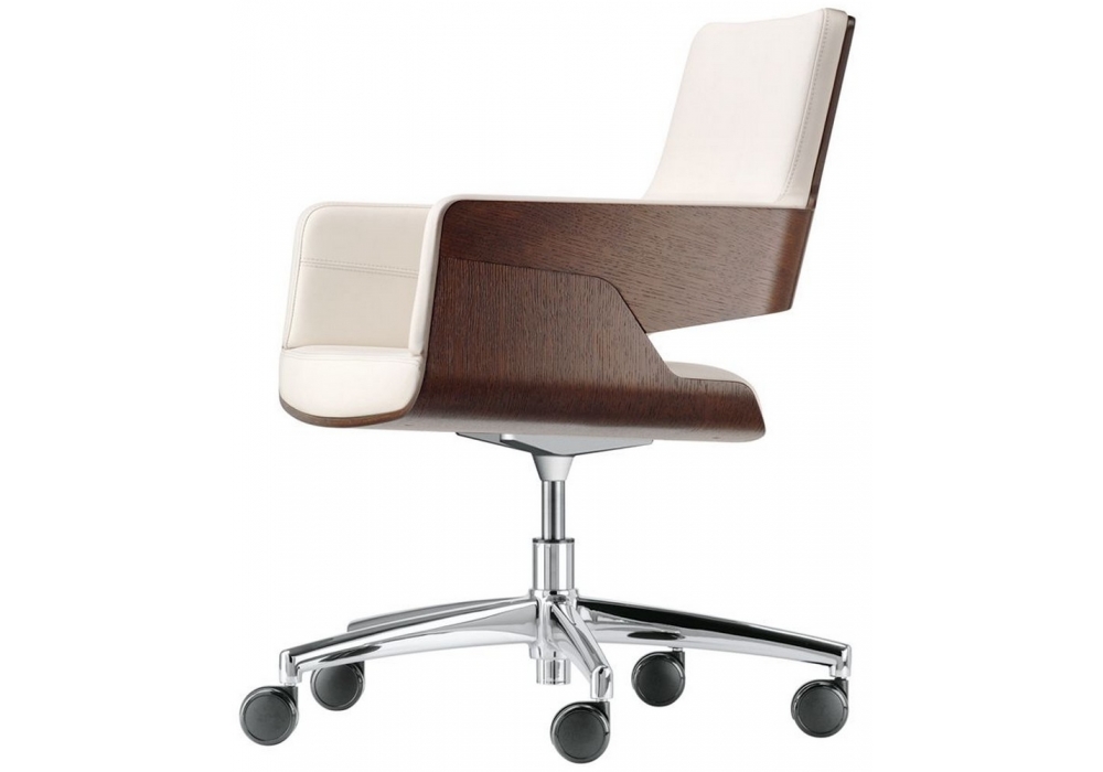 S 845 DRW diseñado por Lepper Schmidt Sommerlade para Thonet es un sillón giratorio con ruedas, estructura de aluminio pulido y mecanismo basculante. Asiento tapizado y respaldo revestido en tela, piel o piel de vacuno. Casco exterior en roble o nogal lacado claro. Altura ajustable.