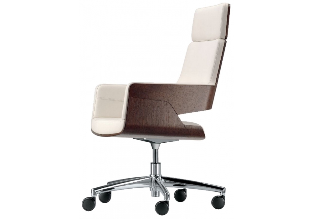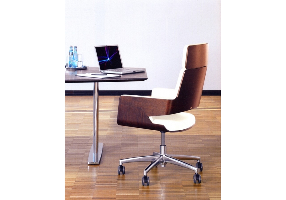 S 845 DRWE diseñado por Lepper Schmidt Sommerlade para Thonet es un sillón giratorio con ruedas, estructura de aluminio pulido, respaldo alto con mecanismo reclinable. Asiento tapizado y respaldo revestido en tela, piel o piel de vacuno. Casco exterior en roble o nogal lacado claro. Altura ajustable.