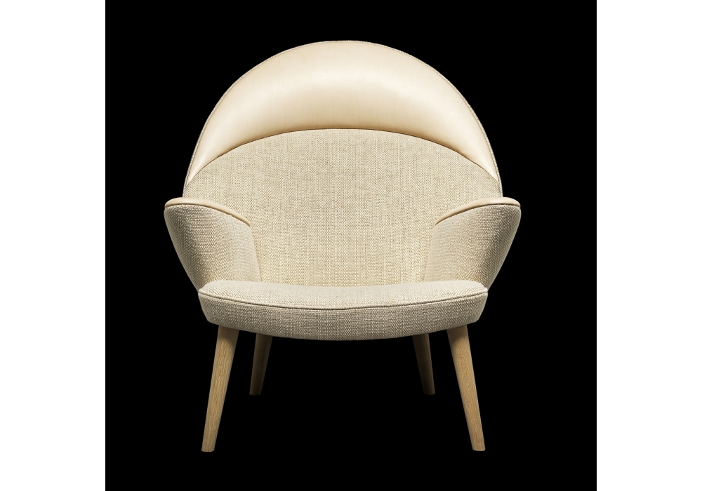 PP521 Upholstered Peacock designed by Hans J. Wegner for PP Møbler is upholstered using only natural materials like flax fibers, cotton, jute straps, palm leaves and horsehair. This is the only way to ensure that this kind of easy chair will be worn in rather than worn out with time. The Upholstered Peacock is, as the name implies, an upholstered interpretation of the pp550 Peacock Chair from 1947, one of Wegner's all time classics and one of his personally most beloved designs. In the Upholstered Peacock Wegner has repeated the arch from the original version and then covered the construction with fabric making a softer chair. The neck and the armrests allow the seated to indulge in the sensible touch of leather, right where it matters the most.
