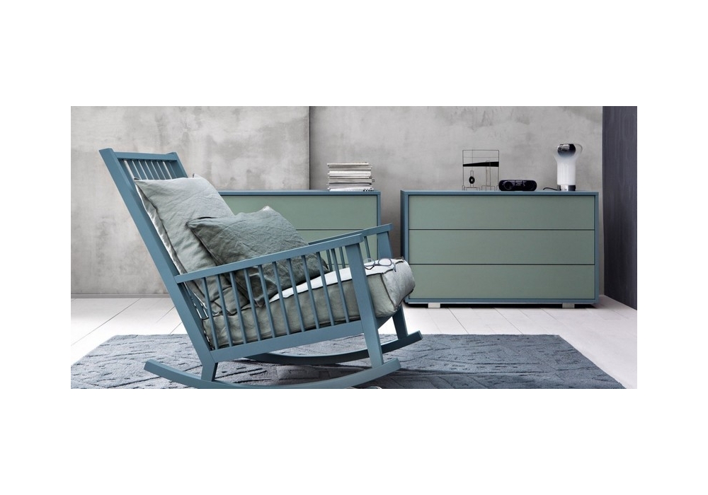 Gray 09 diseñada por Paola Navone para Gervasoni es una mecedora realizada con estructura en nogal o roble, los cojines están tapizados en mixto plumón con tejido.