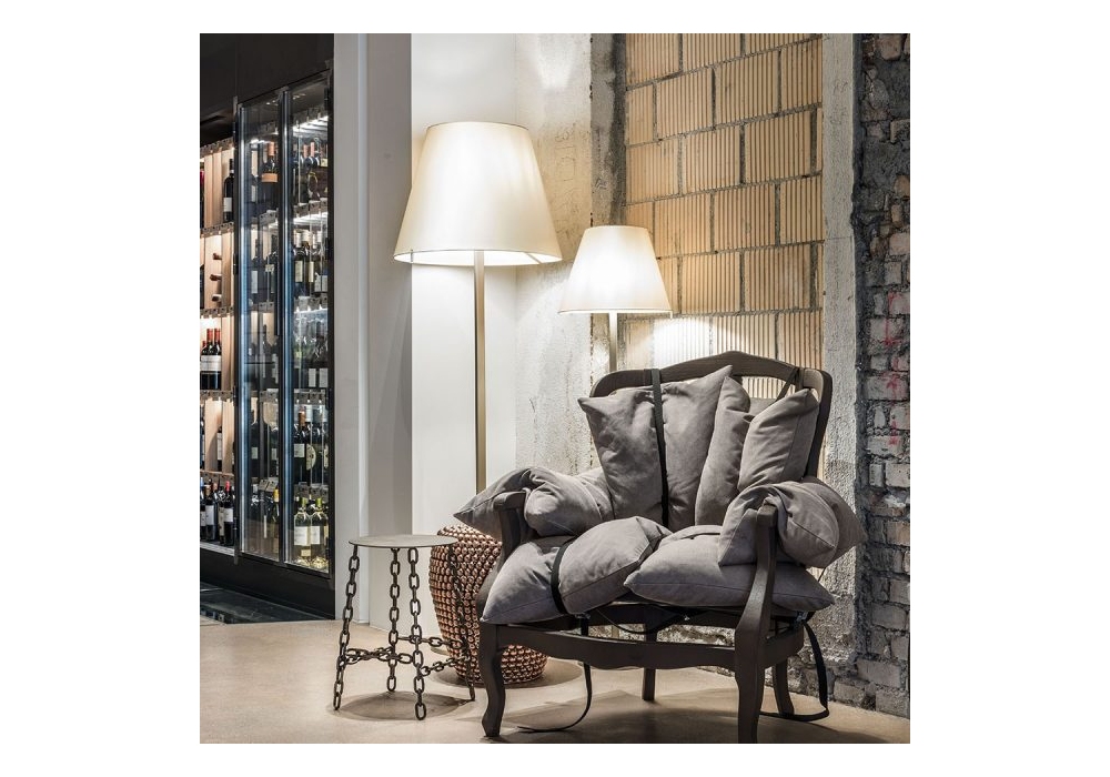 7Pillows diseñada por Marcantonio para Mogg es una butaca de haya maciza, disponible con estructura en color marrón o negra. Completo con 7 cojines de plumas con revestimiento desenfundable.
