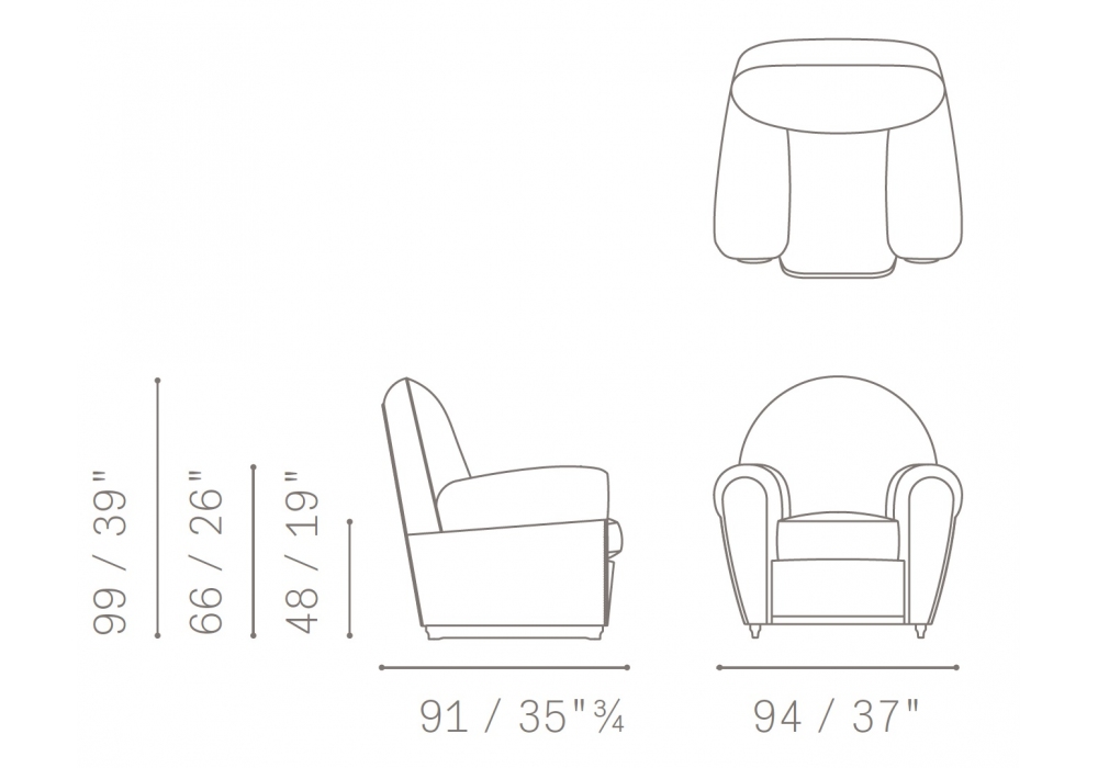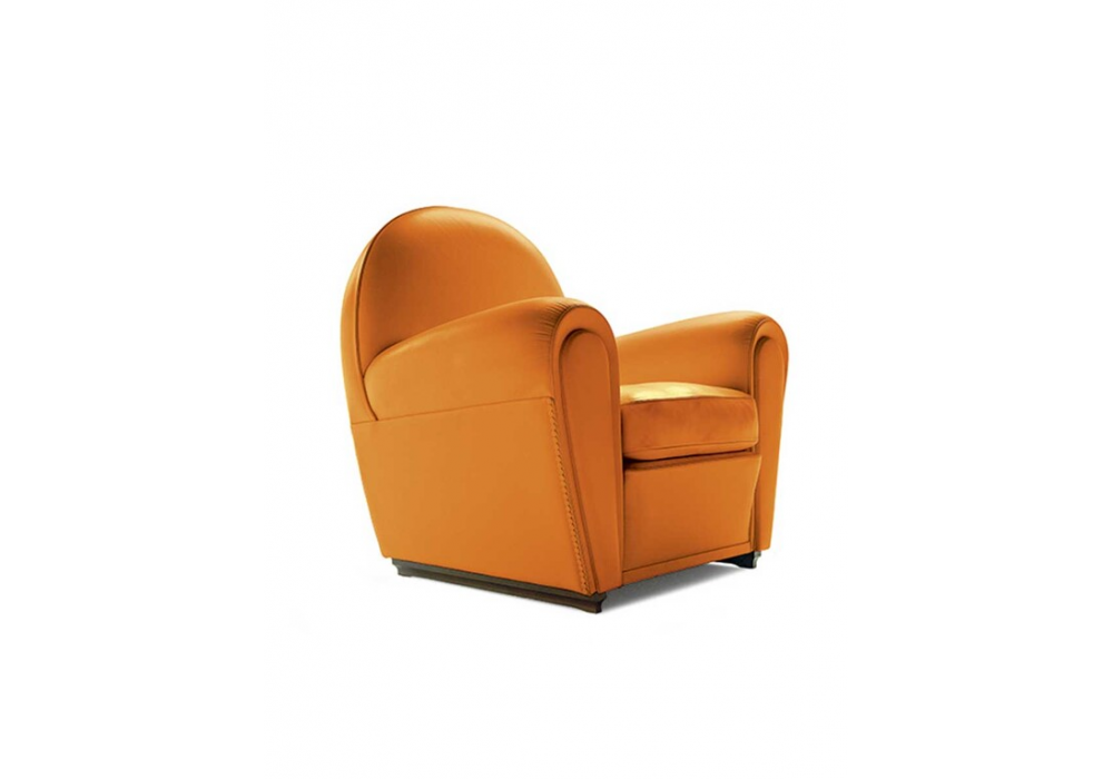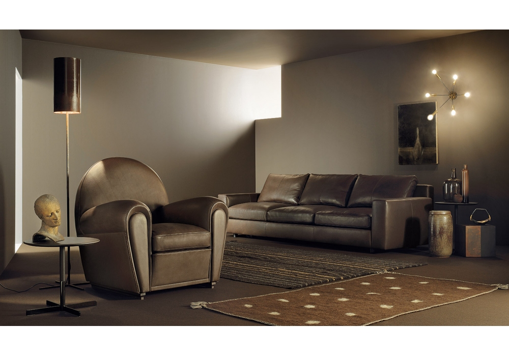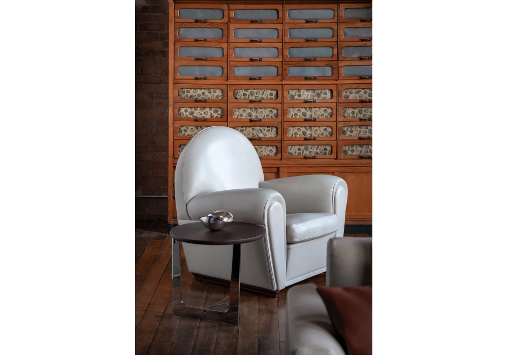 Vanity Fair diseñada por Renzo Frau para Poltrona Frau es una butaca con estructura portante en madera maciza de haya curtida, muelles bicónicos de acero atados a mano y sujetos con correas de yute. Soportes de madera de haya teñida de color nogal oscuro. Cojín de asiento relleno de pluma de ganso. Tapizado en piel Pelle Frau® o tela. Disponible con puf.