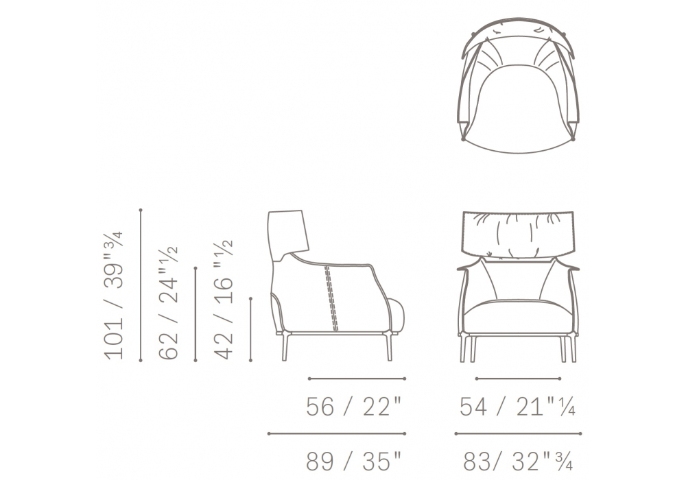Archibald King diseñada por Jean-Marie Massaud para Poltrona Frau es una butaca con cuatro patas de aluminio fundido conectadas a un bastidor de tubo de acero, disponible en los siguientes acabados: gris plomo, bruñido y titanio. Puede revestirse en cuero o tejido. Costuras en contraste en los bordes y en las superficies exteriores de la tapicería de piel. Pespuntes tono sobre tono en la versión en tejido.
