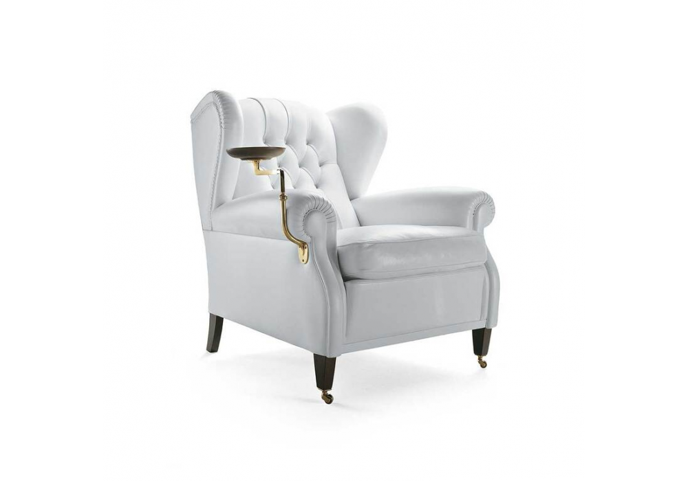 1919, diseñado por Poltrona Frau, es un sillón con estructura de soporte en madera de haya curtida y cojín de asiento relleno de pluma de oca. Los pies traseros son de madera de haya teñida en color nogal oscuro y los delanteros llevan ruedas de latón en acabado dorado o gris plomo. Este sillón está disponible en las siguientes versiones: sin plato o con cenicero / portavasos (derecha o izquierda). El respaldo presenta un diseño capitonné hecho a mano. El respaldo exterior del sillón está rematado con una hilera de tachuelas recubiertas de cuero. Tapizado en piel Pelle Frau®.
