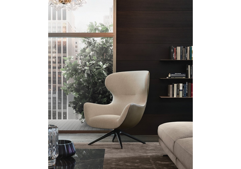 Mad Joker diseñado por Marcel Wanders para Poliform es un sillón giratorio con base de metal pintado, tapizado en tela o piel.
