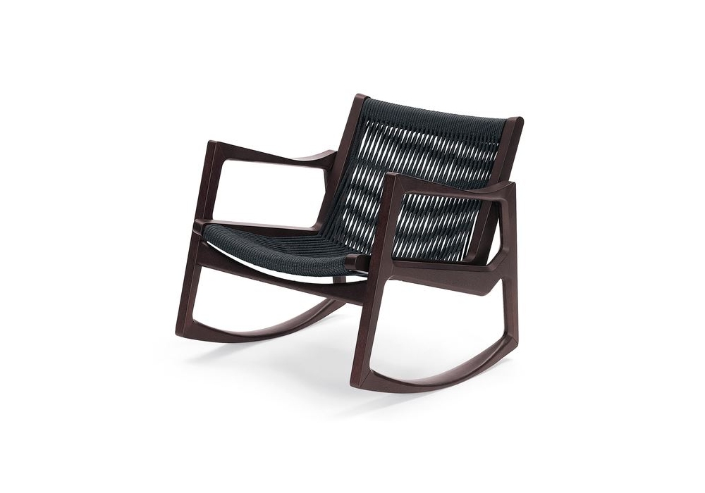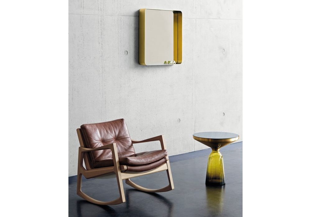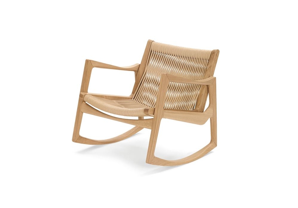 Euvira diseñada por Jader Almeida para ClassiCon es una mecedora con estructura de roble macizo en acabado natural, barnizado en marrón o negra. Acolchado de poliuretano con cintas de goma y tapicería de piel o tela. Disponible en diferentes acabados.