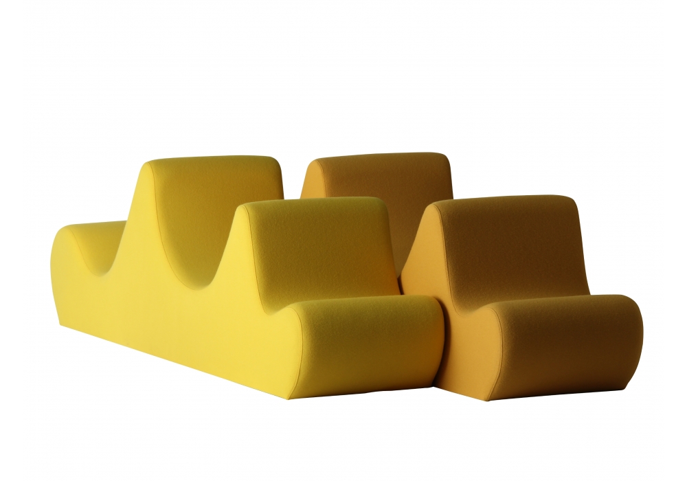 Welle 3 diseñado por Verner Panton para Verpan es un asiento realizado en espuma de poliuretano y base en MDF con patas en nylon. La tapicería está disponible en múltiples colores y variantes de tela.