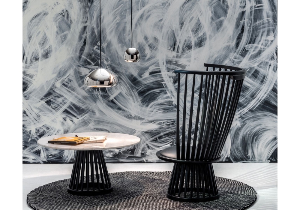 Fan Lounge Chair diseñada por Tom Dixon es una butaca con respaldo alto. Asiento con cojín tapizado en cuero negro. Estructura disponible en diferentes acabados.