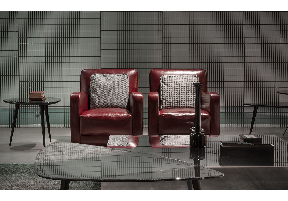 Berlino firmada por Paola Navone por Baxter es una butaca con rivestimiento en pieles suaves. Patas en metal cepillado.