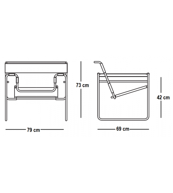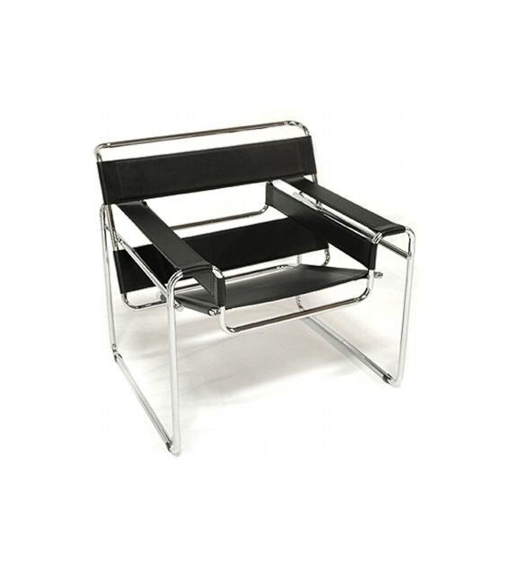 Wassily diseñado por Marcel Breuer para Knoll es un sillón con estructura de tubo de acero cromado o pintado epoxi mate. Tapicería en correas de piel o lona en diferentes acabados.