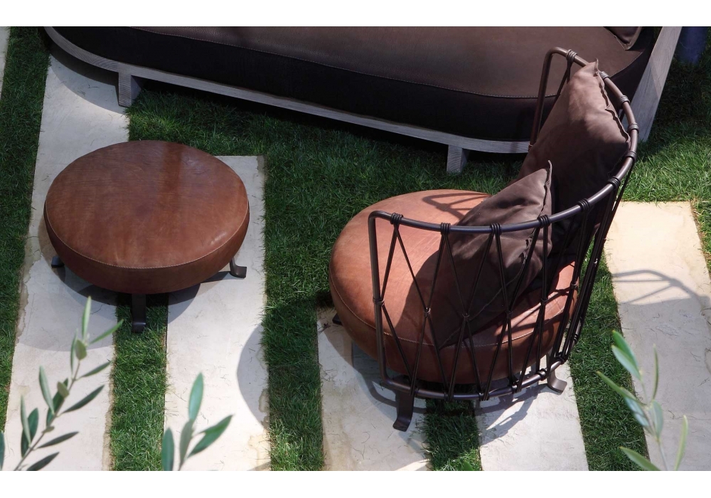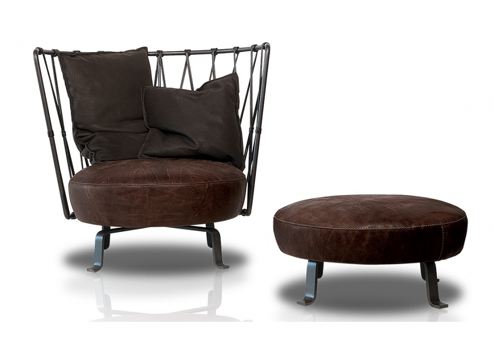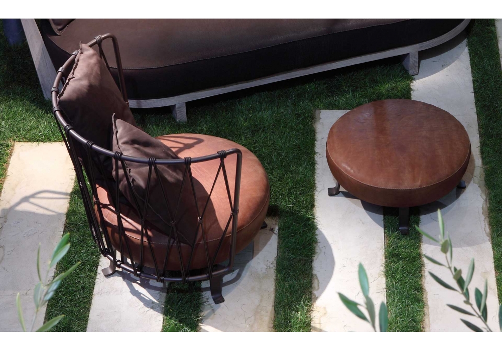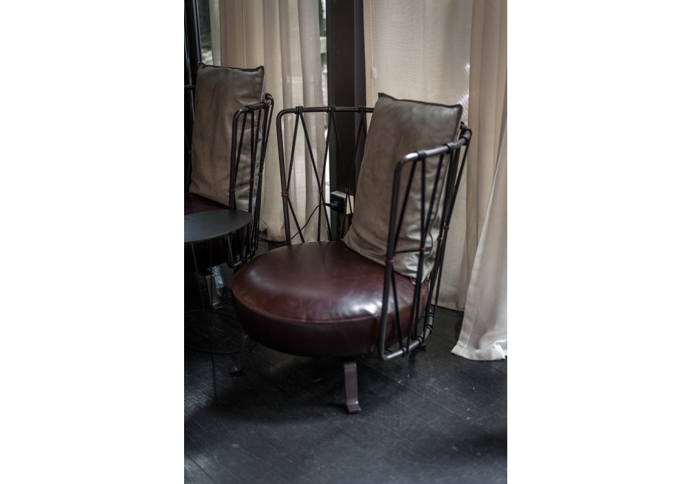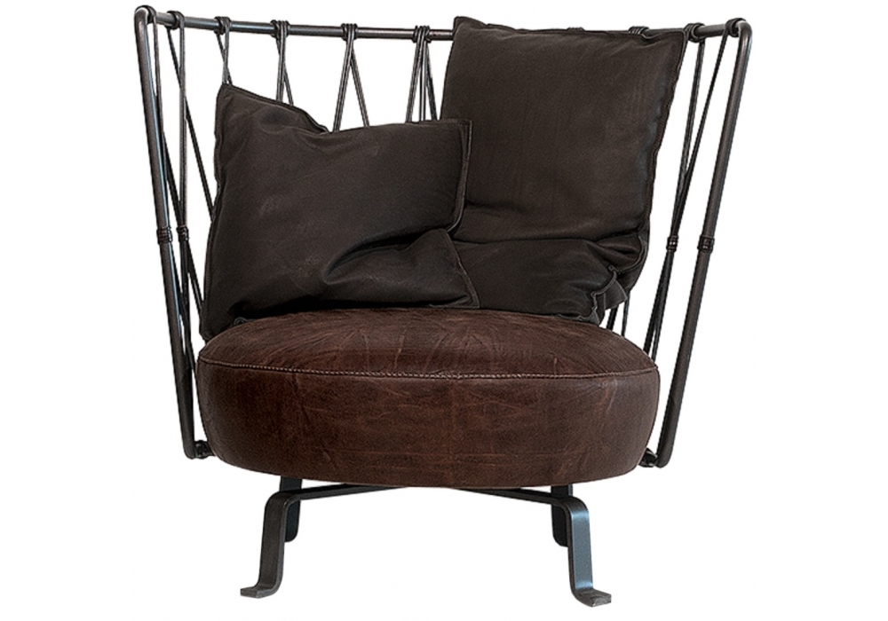 Pedro diseñado por Roberto Lazzeroni para Baxter es un hermoso sillón con estructura de metal barnizada negro mate. Cojín acolchado en espuma de poliuretano con fibra acrílica de 100% poliéster. Respaldo entrelazado con cuero, color marrón oscuro. Base giratoria. Cojín 50 x 70 cm incluido.