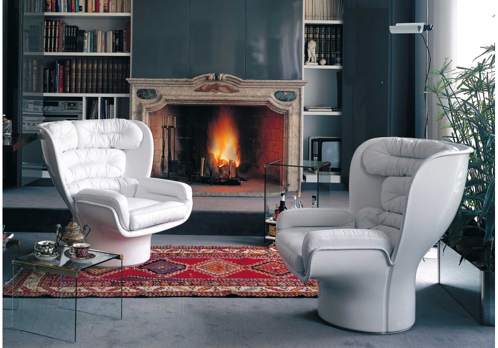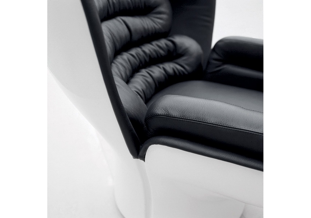 Elda diseñada por Joe Colombo para Longhi es una butaca con carcasa giratoria de 360° realizada en fibra de vidrio artesanal, revestimiento interno en piel o tejido indemovible acolchado con poliuretano expandido anatómico de diferentes densidades, revestido en Dacron. Bajo pedido, está disponible con carcasa metálica o totalmente tapizada en piel.