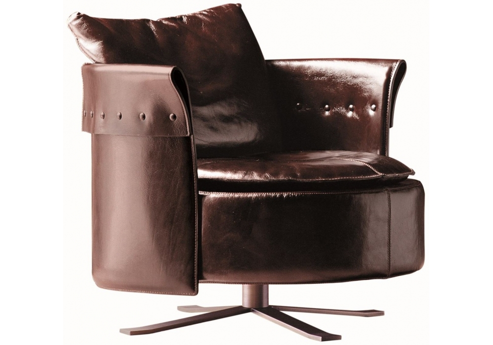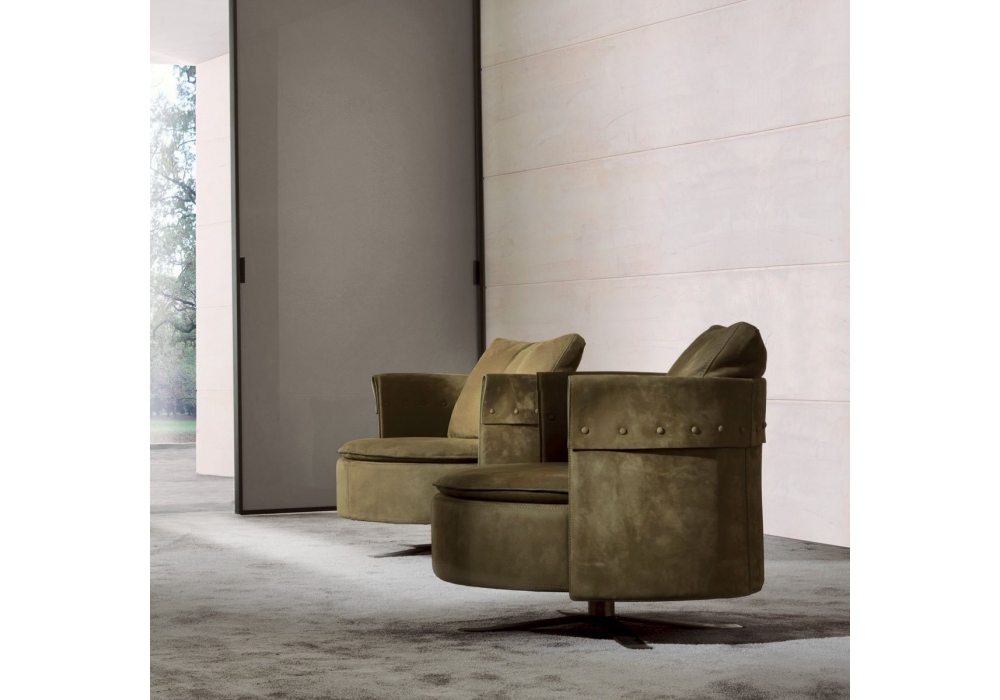 Charme diseñada por Giuseppe Viganò para Longhi es una butaca con estructura de respaldo en metal ensamblado sobre un asiento de madera de abeto con correas elásticas, recubierto de espuma de poliuretano de alta densidad de diferentes densidades. Cojín de asiento en espuma de poliuretano de densidad media y Dacron. Cojín de respaldo anatómico en plumón de ganso esterilizado. La tapicería de cuero, dada la particular mano de obra, no es desenfundable. Base de metal rectificado con acabado bronce satinado mate.