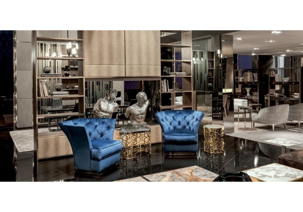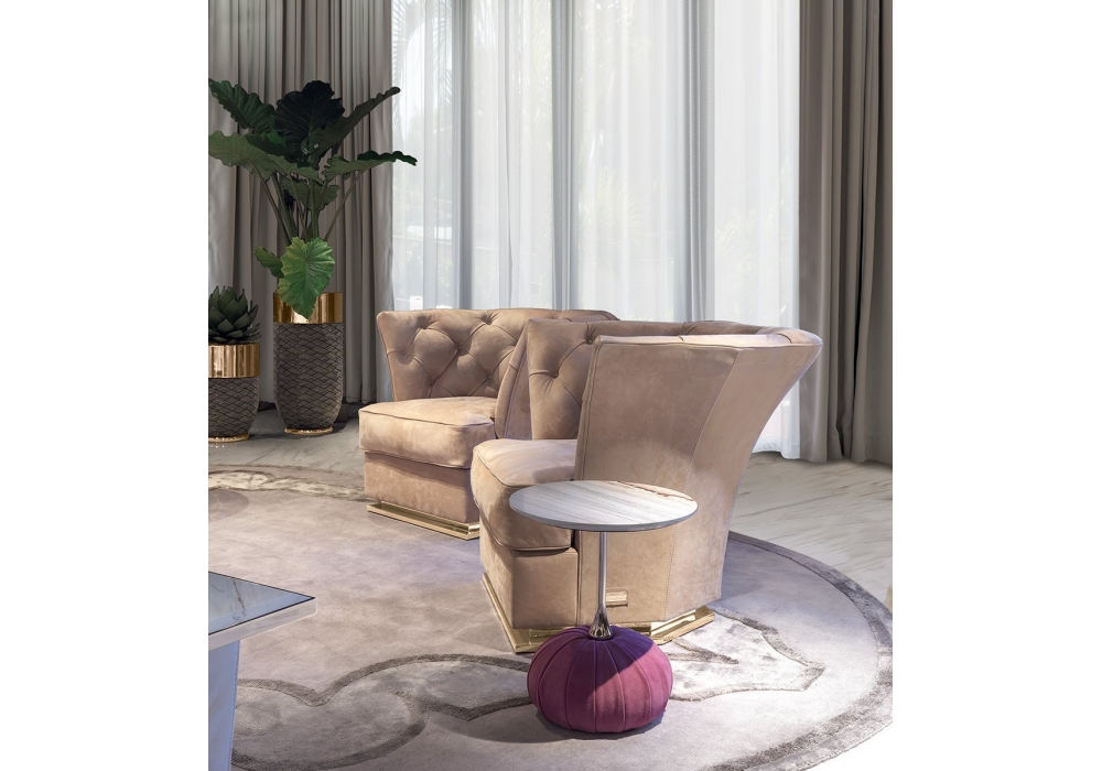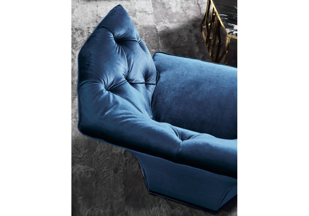 Saki diseñada por Silvia Musetti para Longhi es una butaca con estructura de madera con bandas elásticas, cubierta de espuma de poliuretano de varios espesores. Cojín de asiento en pluma de ganso esterilizada con inserto en espuma de poliuretano de espesor múltiple. El tapizado interno tiene un patrón "Capitonnè", con botones en color liso. Base metálica disponible en acabados diferentes. Dado el tratamiento especial, tanto el tapizado en piel como en tejido, no son desmontables.