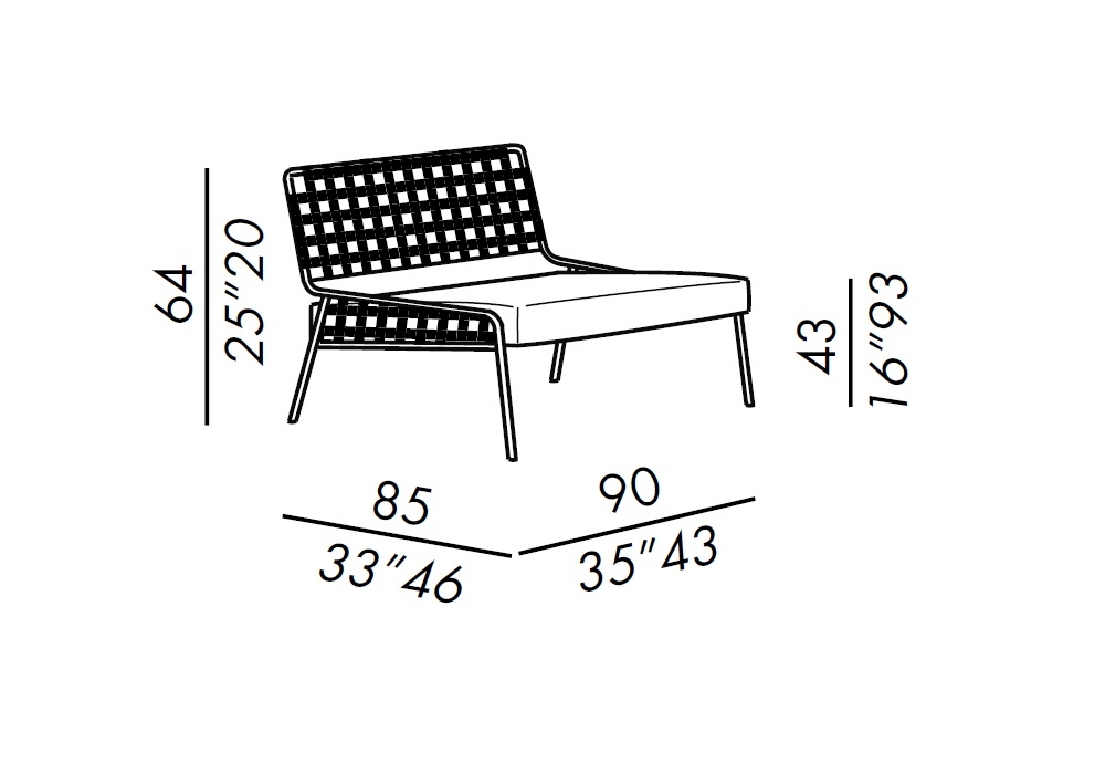 Zoe diseñada por Andrea Parisio para Meridiani es una butaca con estructura en aluminio barnizado y cojín en poliuretano y fibra de poliéster. Respaldo y lado entretejidos en cuerda de cuero natural entretejido CHECKED.