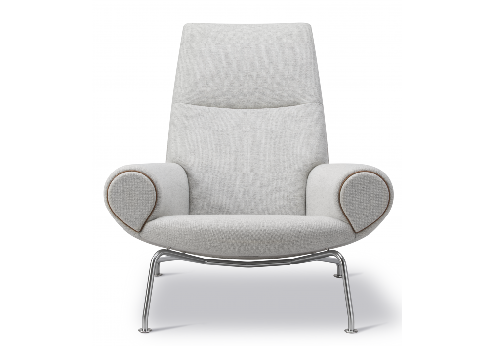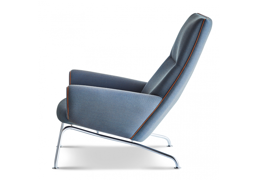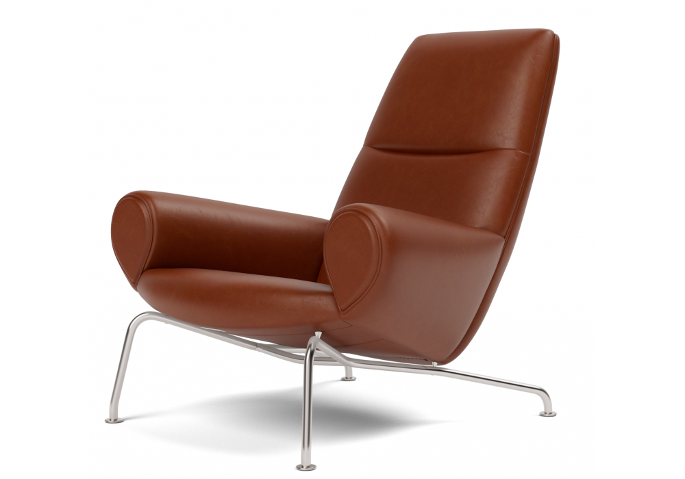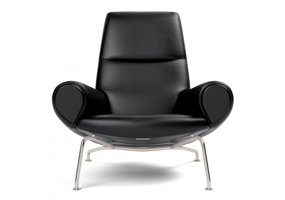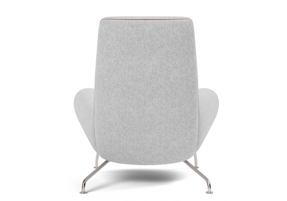 Wegner Queen diseñada por Hans J. Wegner para Fredericia es una butaca con estructura interna en madera maciza y espuma moldeada en frío. Tapizado en diferentes tejidos o pieles y estructura de acero inoxidable. Bajo pedido, el perfil del respaldo y los reposabrazos están disponibles en cuero en contraste con el revestimiento de tela.