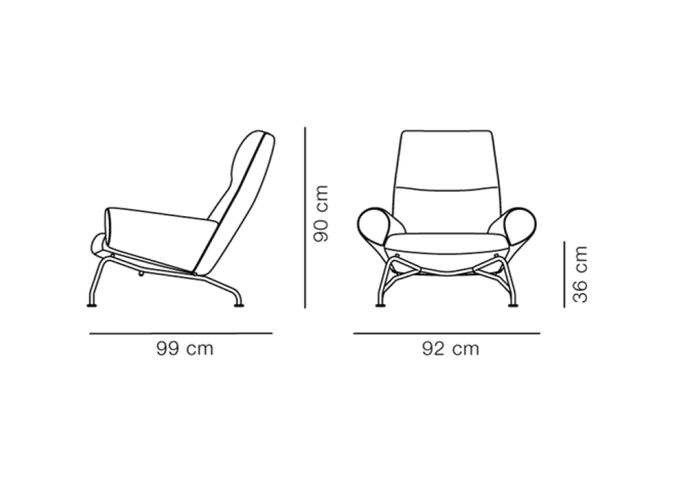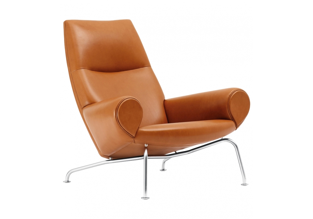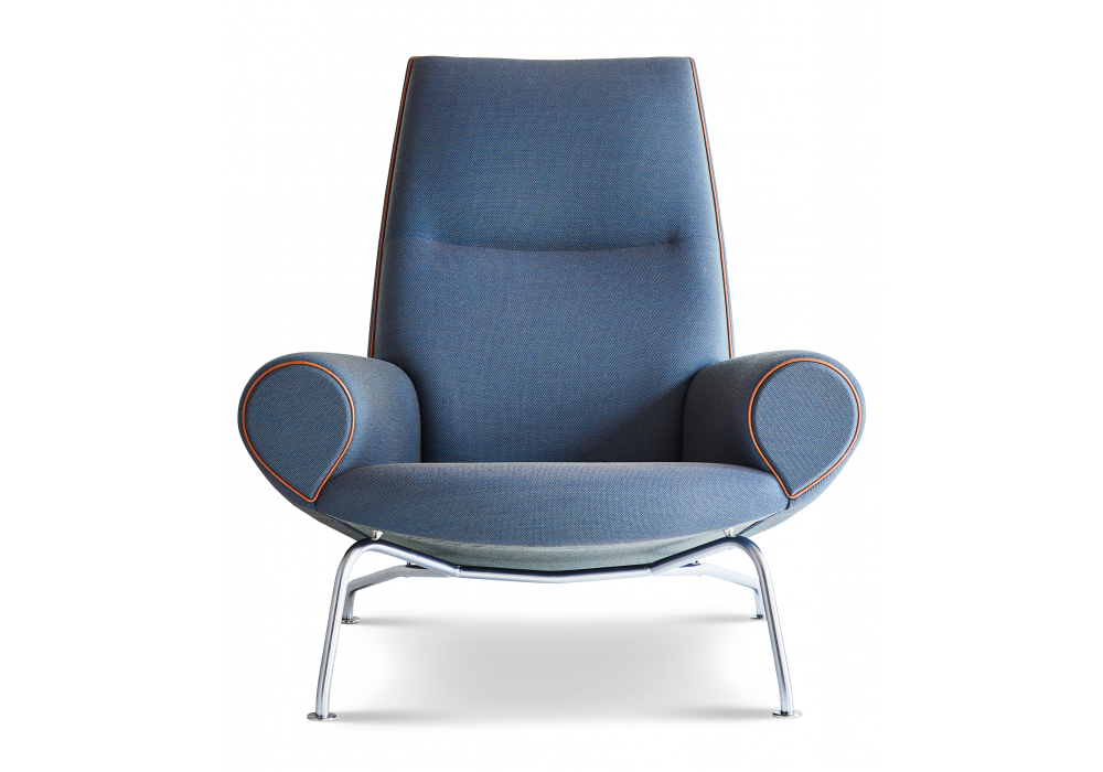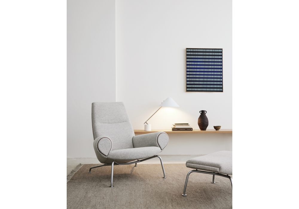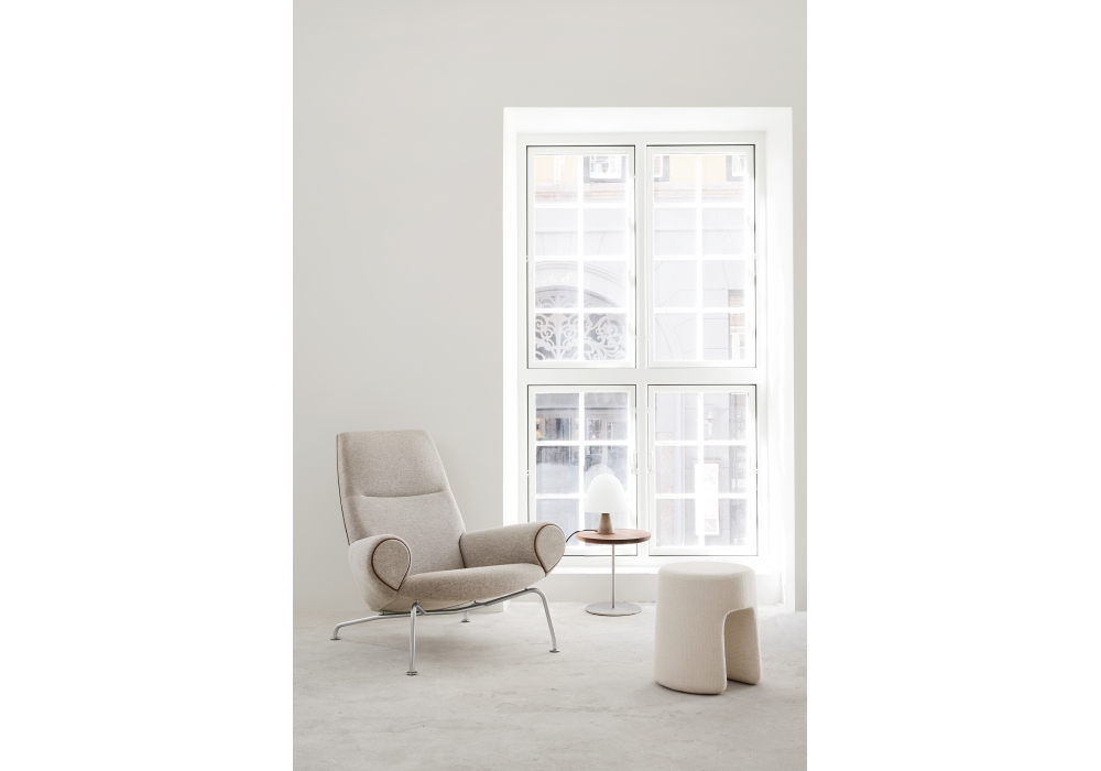 Wegner Queen diseñada por Hans J. Wegner para Fredericia es una butaca con estructura interna en madera maciza y espuma moldeada en frío. Tapizado en diferentes tejidos o pieles y estructura de acero inoxidable. Bajo pedido, el perfil del respaldo y los reposabrazos están disponibles en cuero en contraste con el revestimiento de tela.