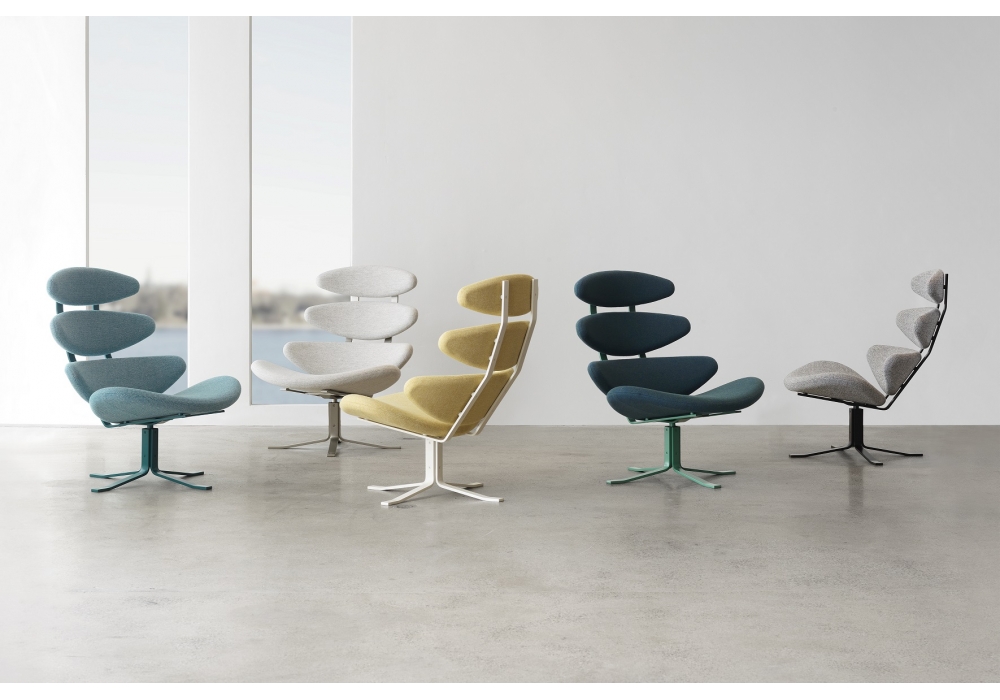 Corona diseñada por Poul M. Volther para Fredericia es una butaca con estructura y base giratoria en acero armónico. Asiento y respaldo formados por cuatro acolchados separados de espuma moldeada en frío, completamente tapizados en tela o piel.