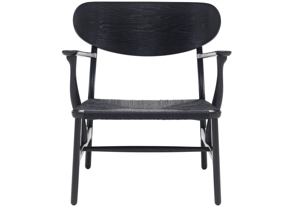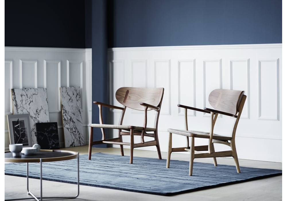 CH22 diseñada por Hans J. Wegner para Carl Hansen & Søn es una butaca con estructura de madera maciza en nogal o roble en diferentes acabados. Asiento en cordón de papel negro o natural. Roble/nogal es una versión combinada con estructura/incrustaciones en roble y reposabrazos/respaldo en nogal. Roble/teca es una versión combinada con estructura en roble y reposabrazos/respaldo/inserciones en teca.