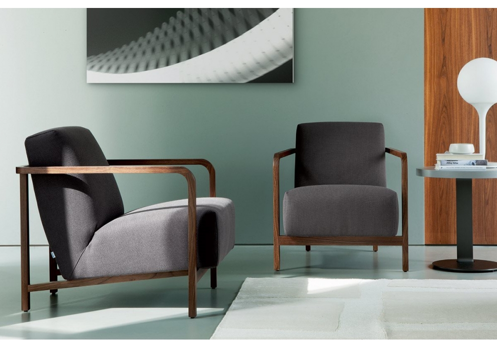 Gilda diseñada por T. Colzani para Porada es una butaca con estructura en nogal canaletta macizo o lacado mate poro cerrado disponible en diferentes acabados y revestimiento desenfundable en tela o piel.