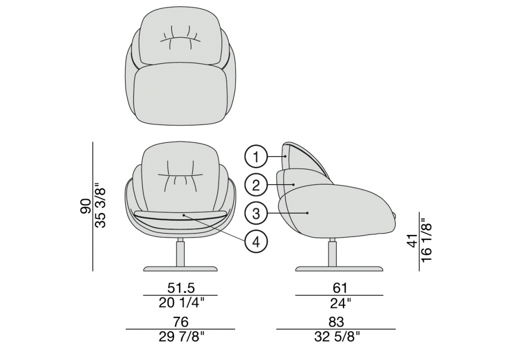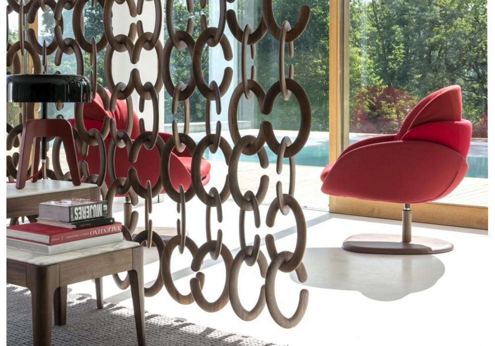 Opium diseñada por M. Walrawen para Porada es una butaca giratoria con retorno automático con base en nogal canaletta macizo o lacado mate poro cerrado disponible en diferentes acabados. El revestimiento en tela o pieles es desenfundable.