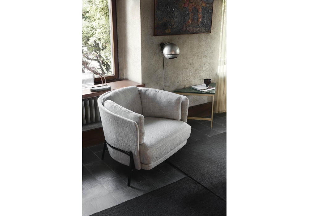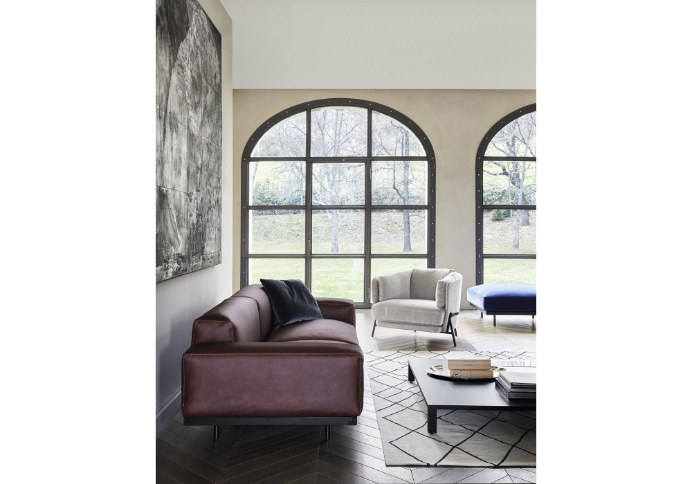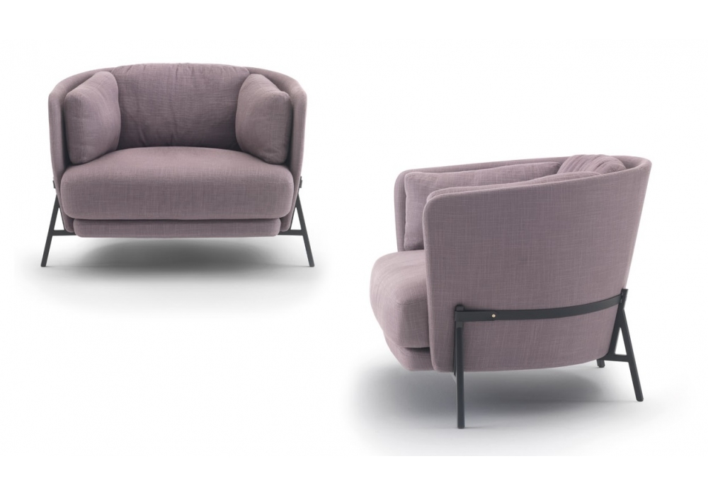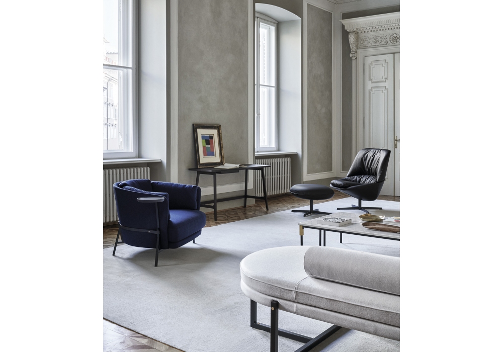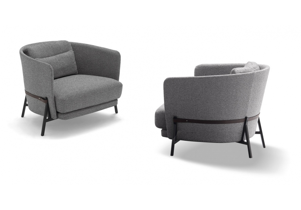 Cradle diseñado por Neri& Hu para Arflex es un sillòn con estructura de metal lacado en negro. Cojín de asiento en poliuretano conformado de densidad diferenciada / fibra de poliéster. Cinturón de piel y tapizado en tejido o piel.