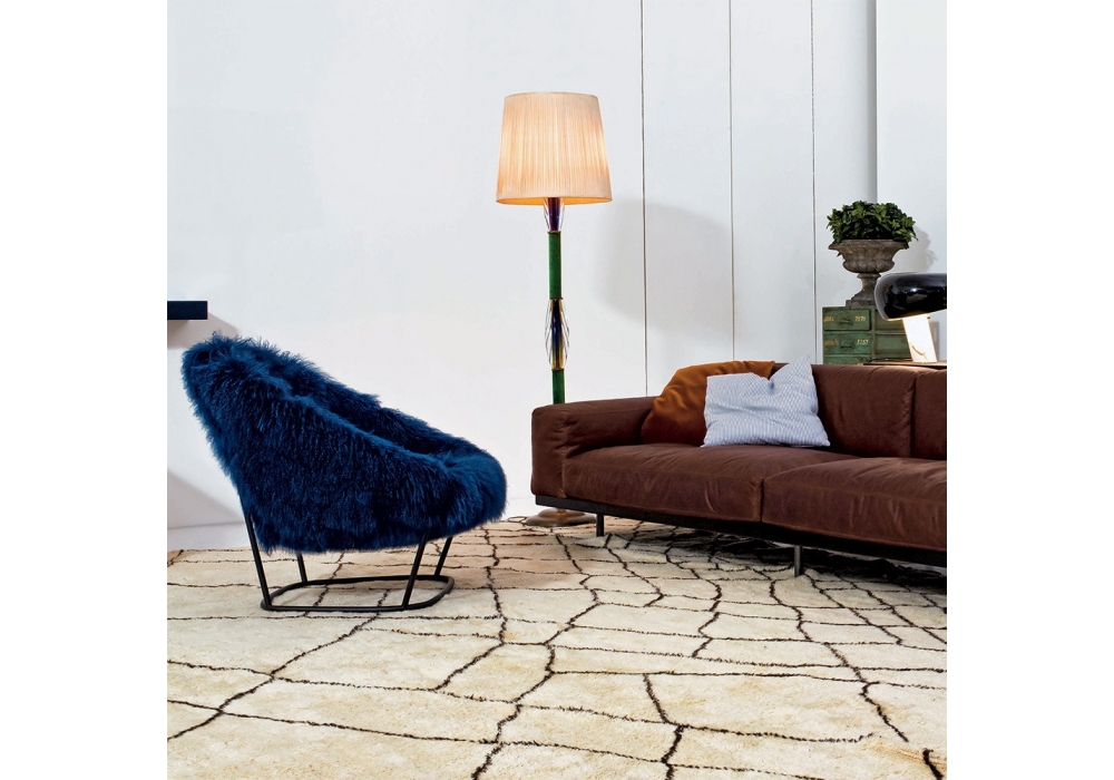 Katrin diseñada por Carlo Colombo para Arflex es una butaca con base en metal lacado blanco o negro. Revestimiento en pelaje.