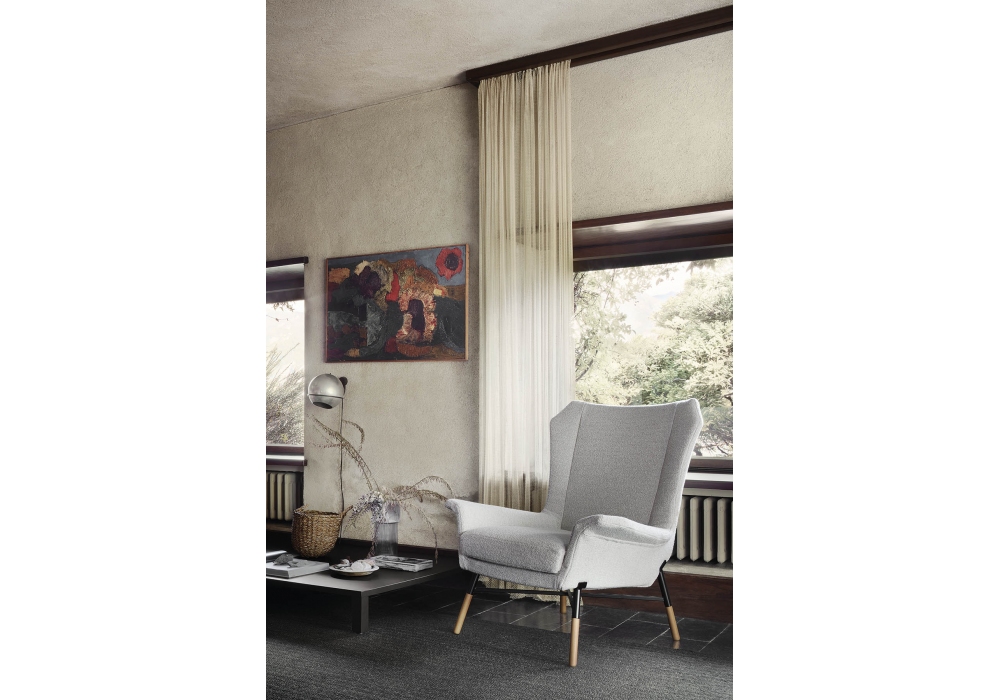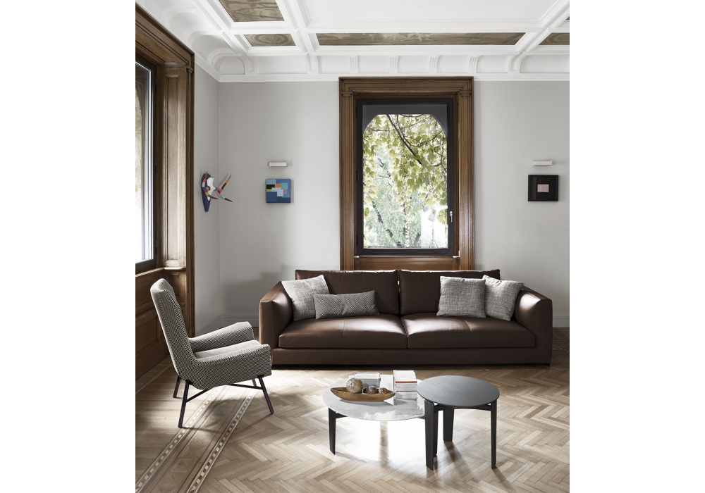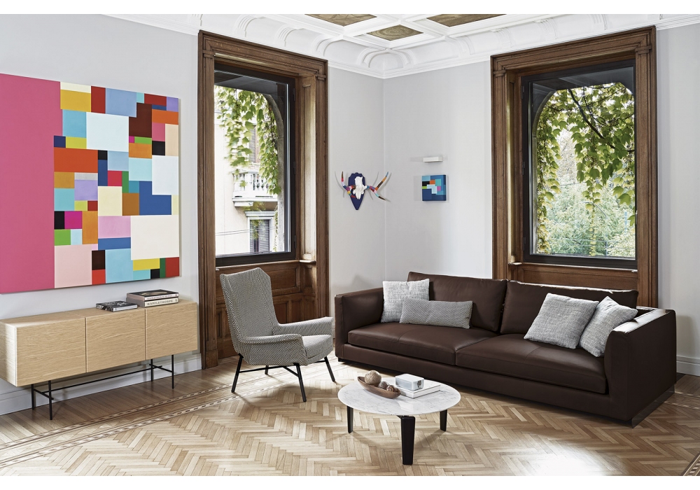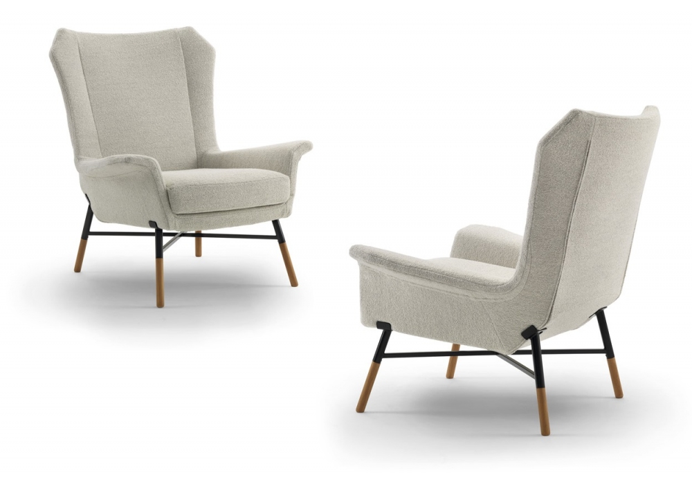 Giulietta diseñado por B.B.P.R para Arflex es un sillòn con patas en metal lacado negro y madera teñida de wengué, roble o chocolate. Cojín del asiento en poliuretano perfilado con densidad diferenciada / fibra de poliéster. Revestimiento en tejido o piel.