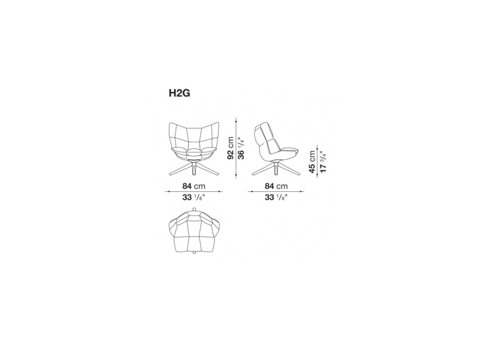 Husk diseñada por Patricia Urquiola para B&B Italia, es una butaca con carcasa de material plástico Hirek de color blanco, negro o gris tórtola. Base giratoria de aluminio fundido a presión, perfiles de acero, poliuretano rígido o madera maciza. Revestimiento en diferentes tejidos o pieles.