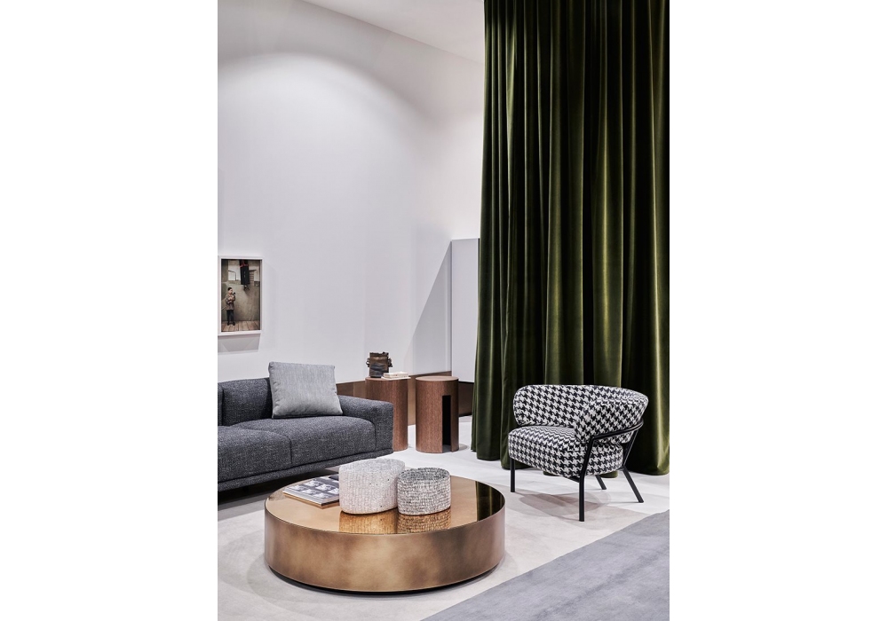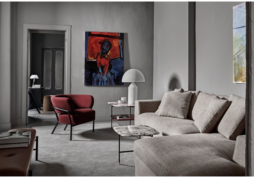 Nanì diseñada por Andrea Parisio para Meridiani es una butaca con estructura de metal barnizado, relleno en poliuretano con densidad diferenciada y fibras de poliéster y tapicería en tejido o piel.