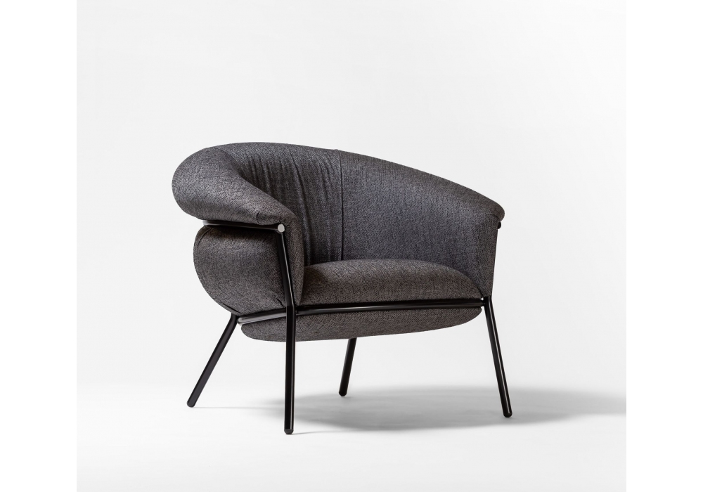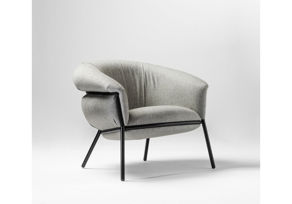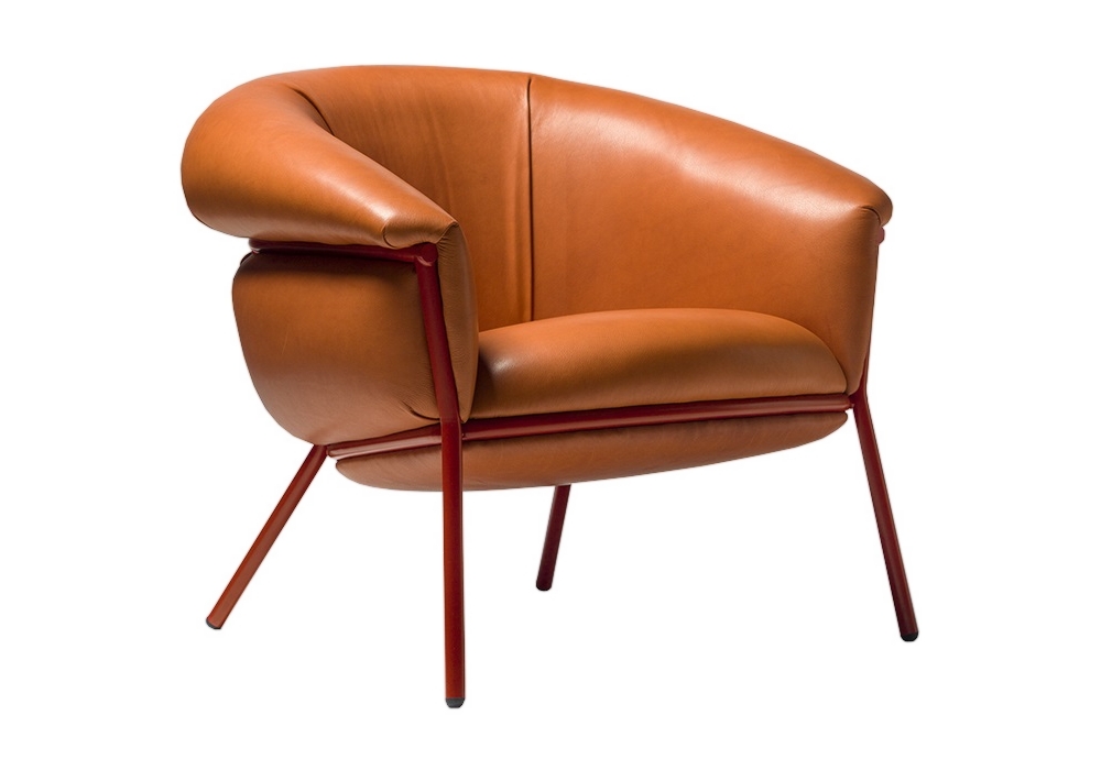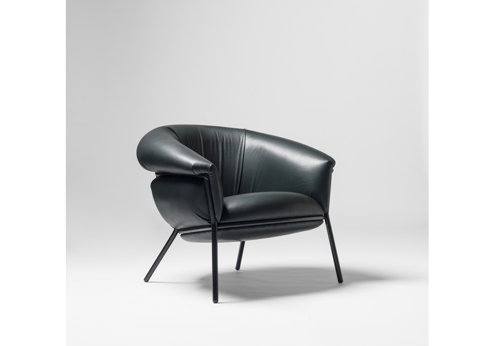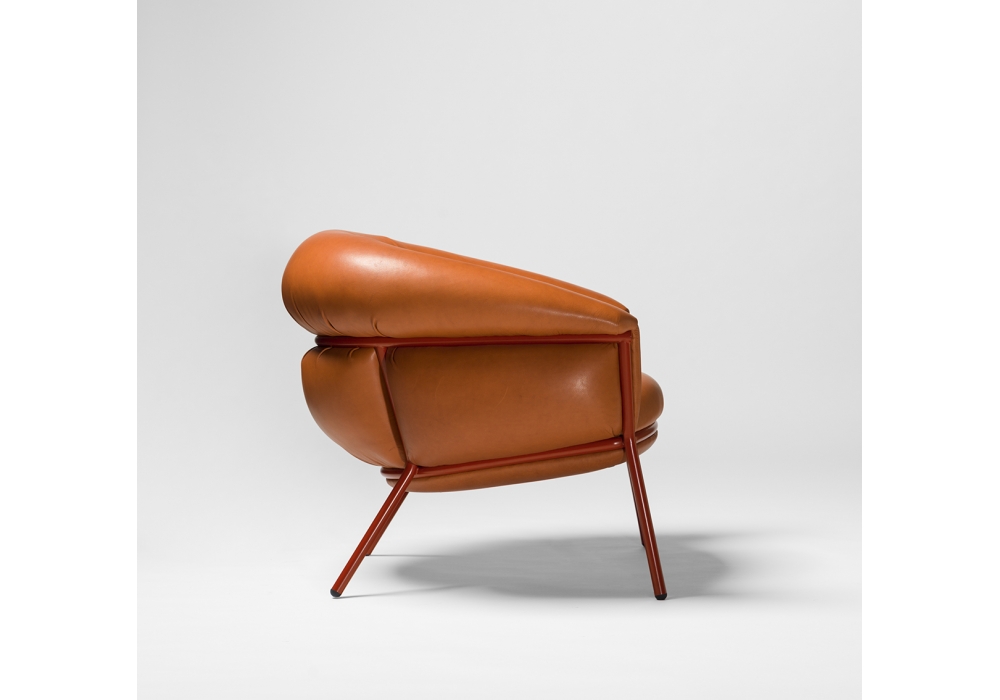 Grasso diseñada por Stephen Burks para BD Barcelona Design es una butaca con estructura de hierro tubular en diferentes acabados y tapizado disponible en diferentes pieles y tejidos. Bajo pedido, también está disponible un reposapiés a juego con el sillón.