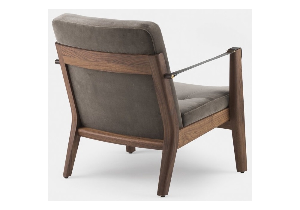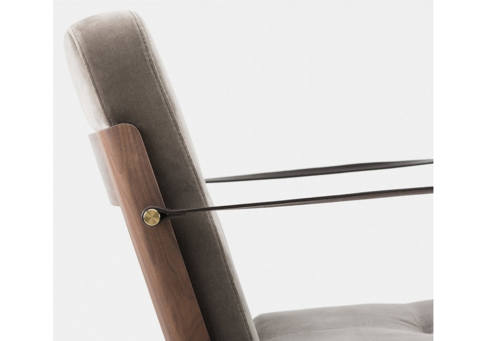 Capo diseñada por Neri & Hu para De La Espada es una butaca con revestimiento en tejido o piel y estructura en madera disponible en diferentes acabados. Apoyabrazos en piel negra o marrón con detalles de color latón.