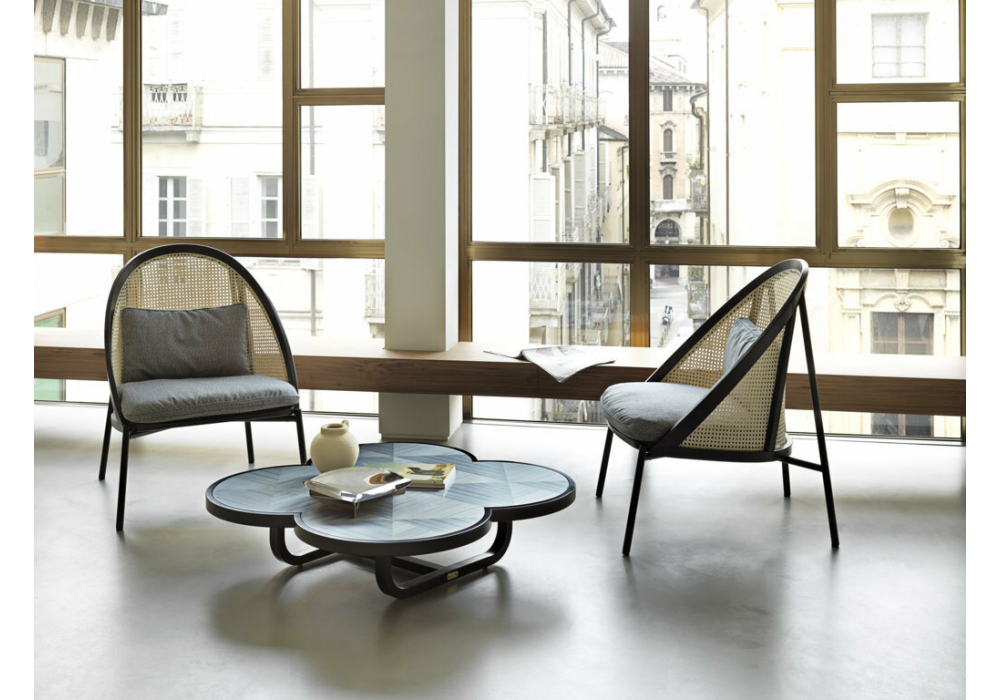 Loïe diseñado por Chaira Andreatti para Gebrüder Thonet Vienna es un sillón con estructura curvada de fresno disponible en diferentes acabados, respaldo en paja Vienna o malla técnica, asiento tapizado con tapizado en tejido o cuero, base de metal.