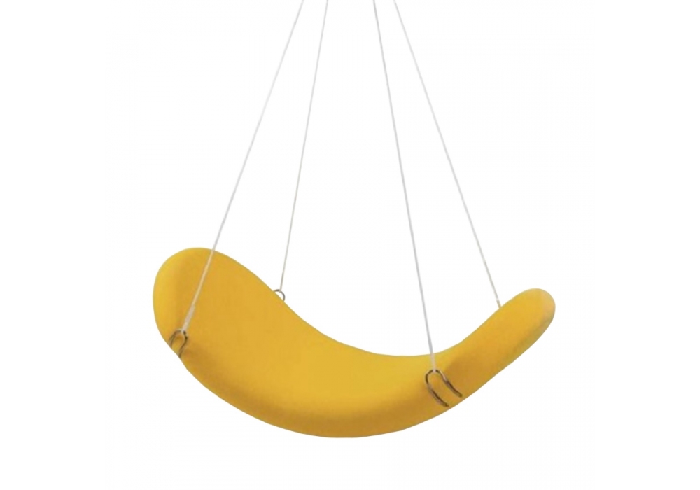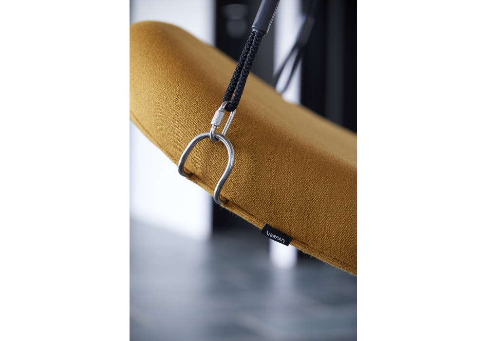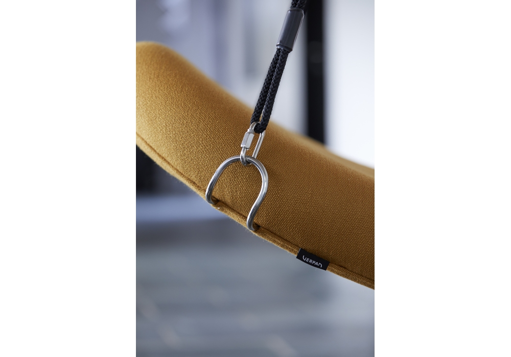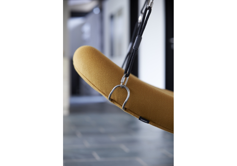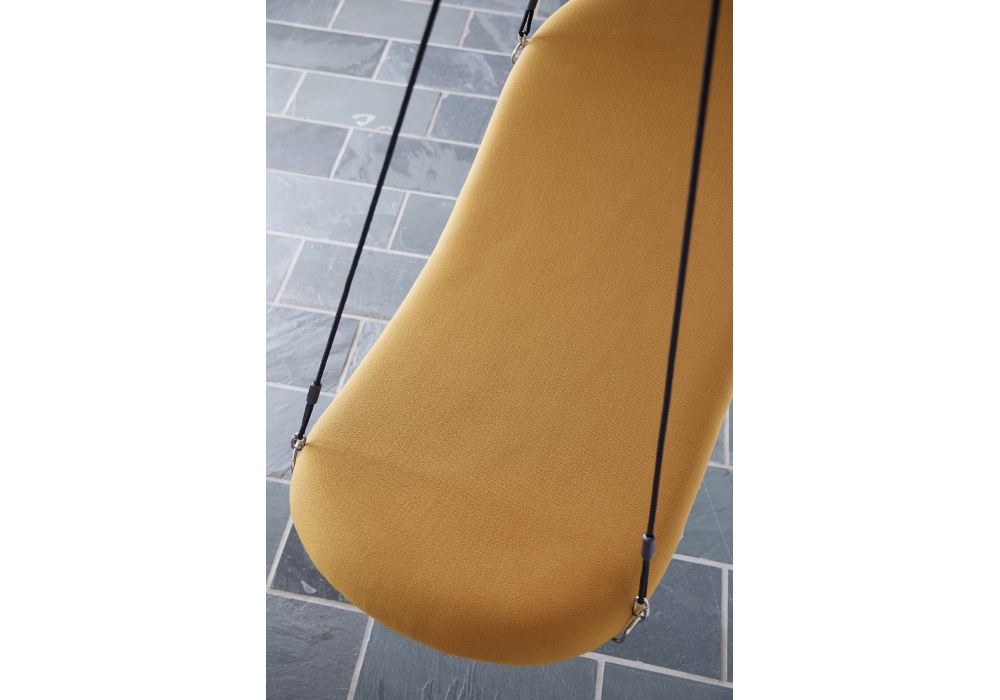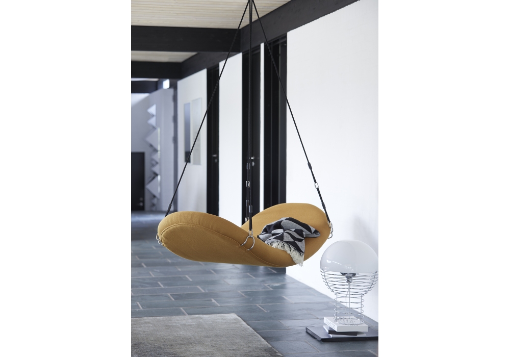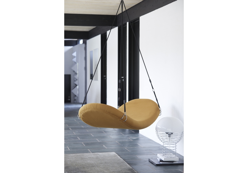 Flying Chair diseñada por Verner Panton para Verpan es un columpio totalmente tapizado. Está suspendido del techo por ambos lados mediante cuerdas de nailon que le permiten ajustar la altura y la posición de sentado. Carcasa de madera contrachapada moldeada y estructura de acero rodeada de espuma y cuerdas de nailon incl. Tapicería en diferentes tejidos.