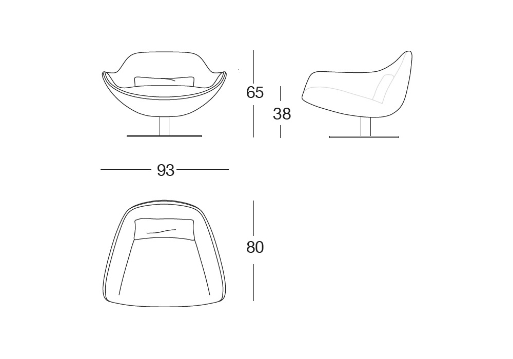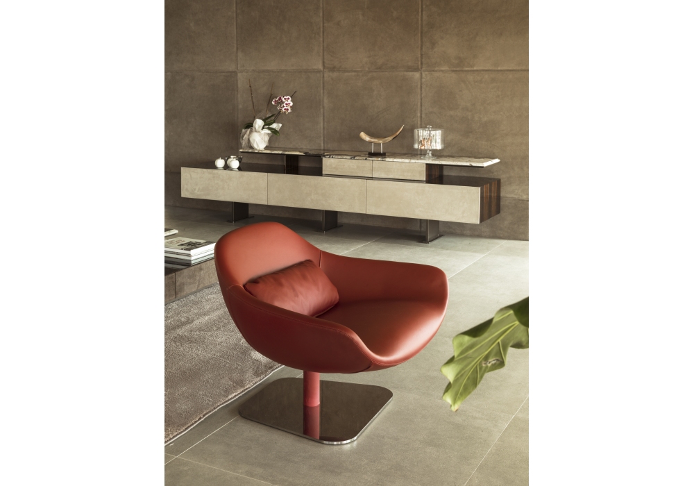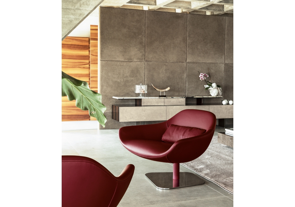 Meredith diseñada por Giuseppe Viganò para Longhi es una butaca con estructura de metal moldeado en frío en espuma. La base gira completamente con un mecanismo de autoalineación en el mismo acabado que la butaca. Cojín lumbar en plumón de ganso esterilizado con revestimiento desmontable. Base de metal disponible en diferentes acabados.