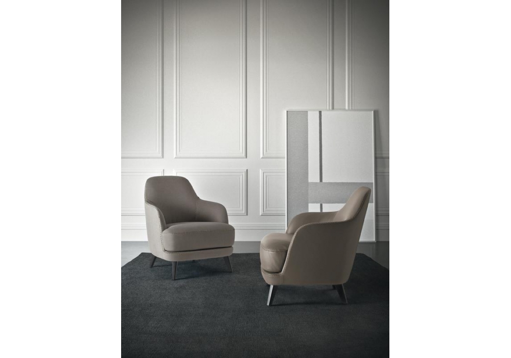 Liz diseñada por Roberto Lazzeroni para Casamilano es una butaca con estructura en contrachapado de abeto y paneles en partículas de madera. Acolchado en espuma de poliuretano de diferentes densidades. Pies en madera maciza de haya, color ébano. Costuras bordadas. Tapiceria extraíble (tejido) / no extraíble (piel).