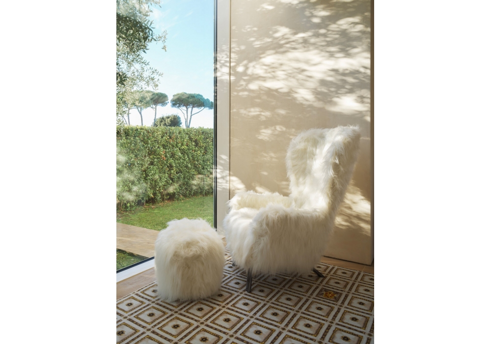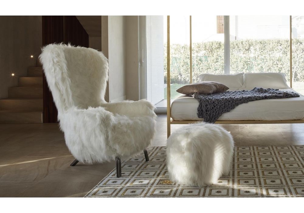 Guelfo Fur diseñada por Lapo Ciatti para Opinion Ciatti es una bergère realizada con estructura de níquel negro y revestimiento de piel ecológica blanca.