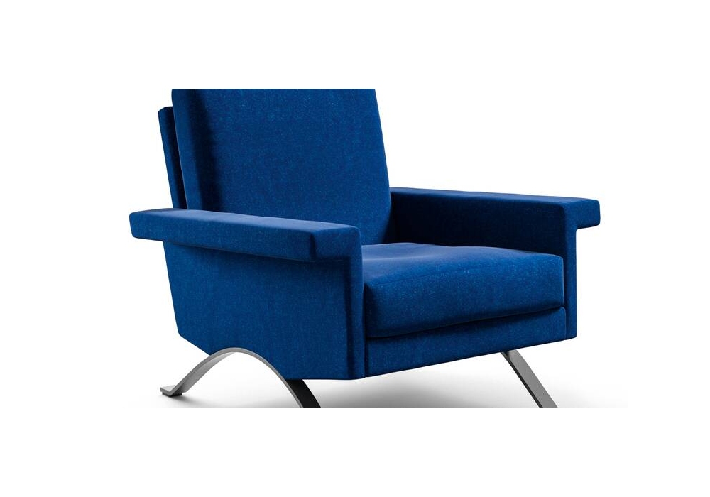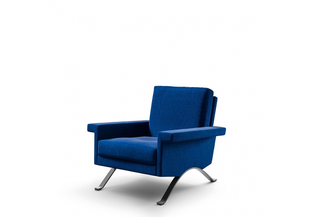 875 diseñado por Ico Parisi para Cassina es un sillón con base en metal curvado, disponible en diferentes acabados y revestimento en tejido o piel.