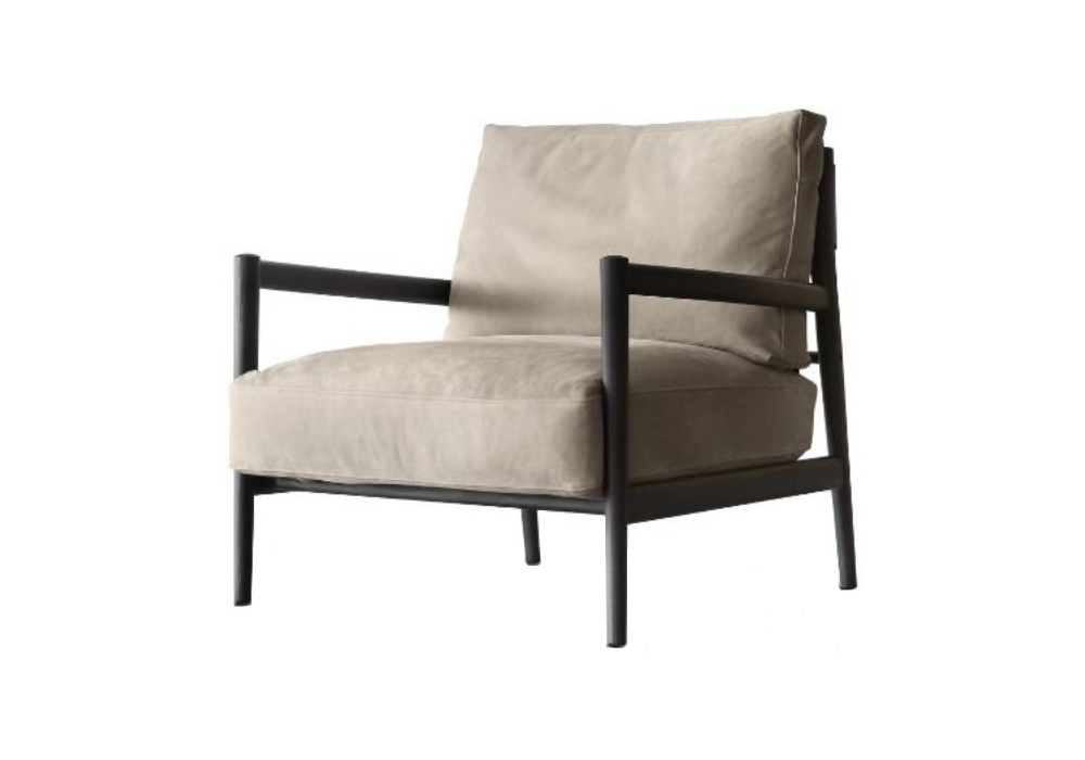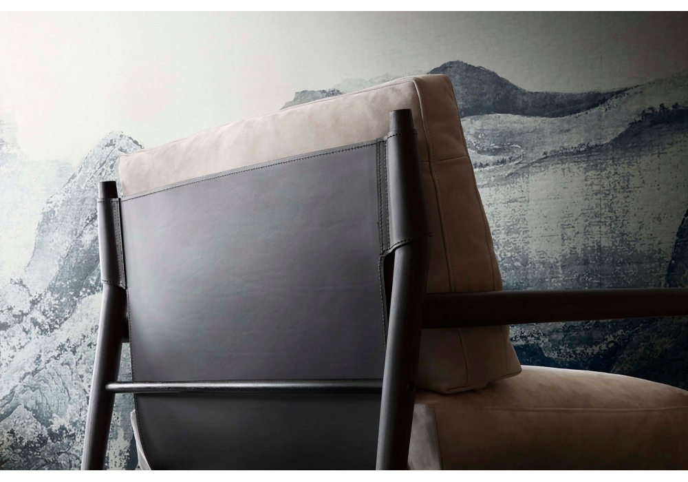 Maddix diseñado por Dainelli Studio para Lema es un sillón realizado con estructura en fresno teñido de roble tratado térmicamente, bajos en piel café claro y tapizado desenfundable en tejido o piel. Disponible en diferentes acabados.