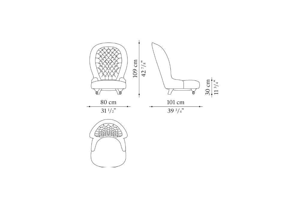 Pole Position diseñado por Luigi Caccia Dominioni para Azucena es un sillón, con tapizado disponible en diferentes materiales. Pies en madera maciza lacada, ruedas delanteras en aluminio pintado.