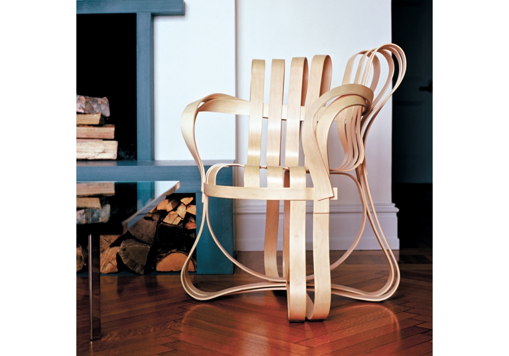 Cross Check diseñada por Frank Gehry para Knoll es una butaca realizada con listones de arce natural. Patas de plástico transparente con acabado mate.