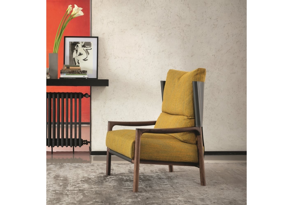 Vera Bergere diseñada por Gabriele & Oscar Buratti para Porada es una butaca con estructura en nogal canaletto, respaldo en cuoietto y tapizado en tejido.