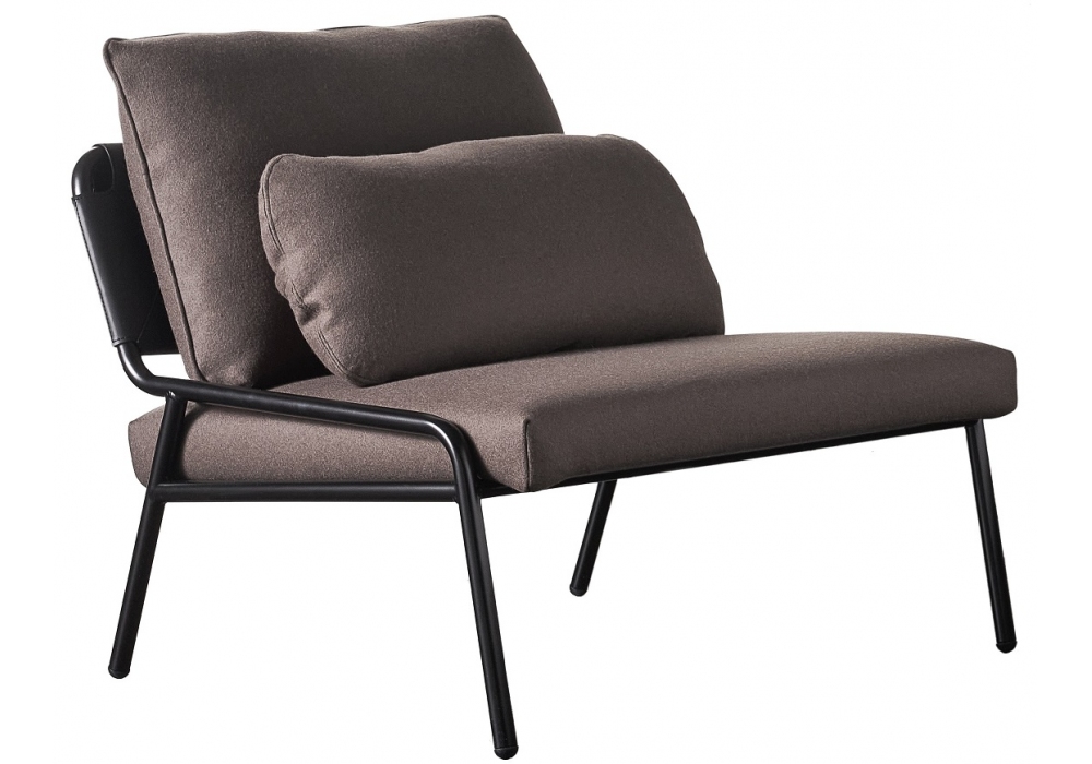 Zoe Kuoio diseñada por Andrea Parisio para Meridiani es una butaca con estructura en aluminio barnizado y cojín en poliuretano y fibra de poliéster. Respaldo tapizado en cuero.