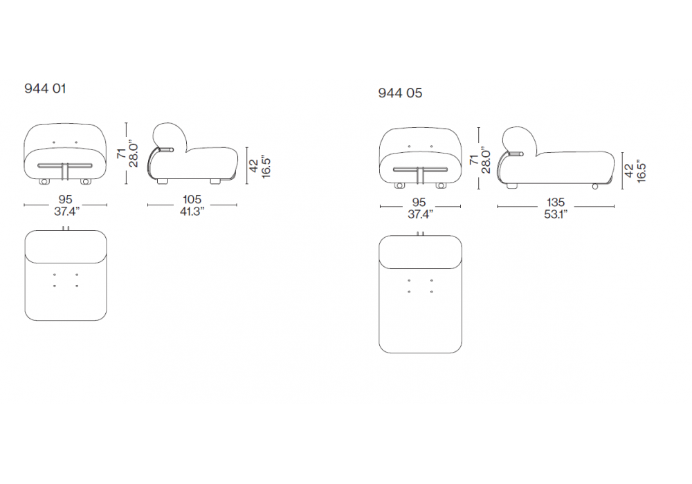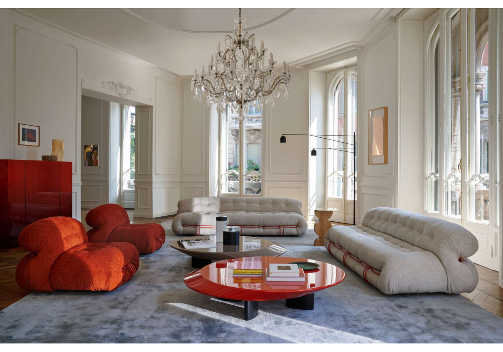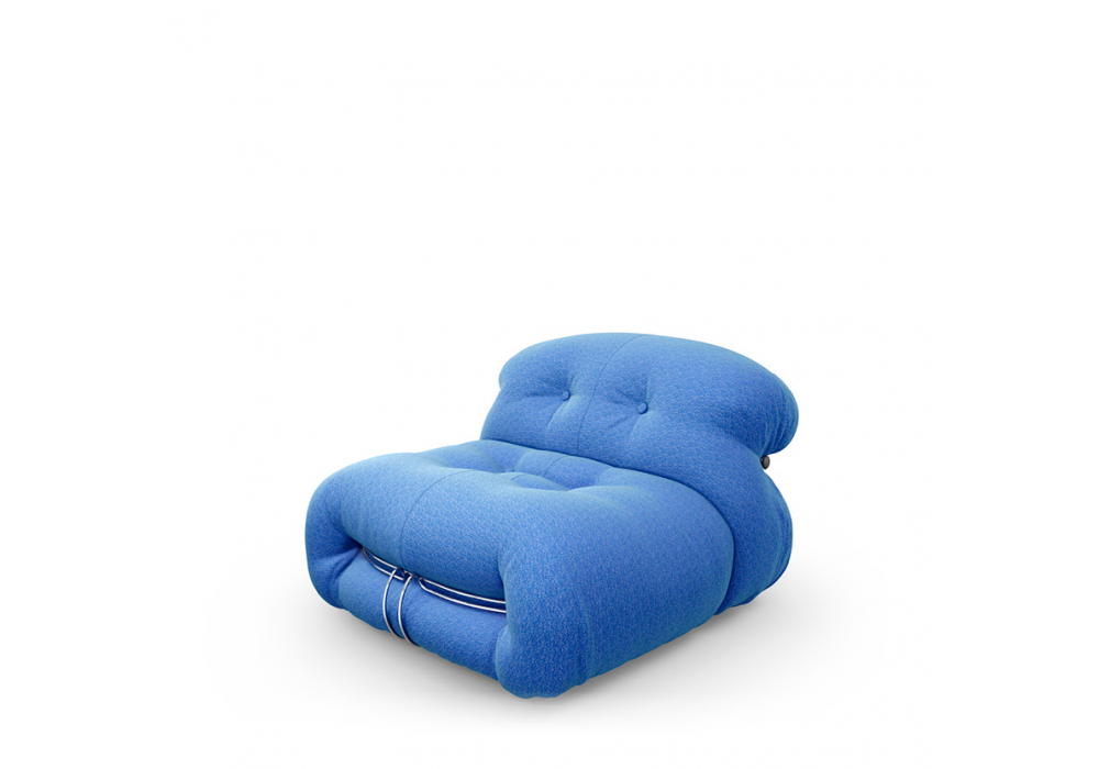 Soriana diseñado por Afra & Tobia Scarpa para Cassina es un sillón realizado con acolchado en PET 100% reciclado o guata. Estructura en metal pintado y tapizado en tela o piel. También disponible en versión chaise longue.
